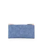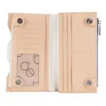 Billetera hecha con material vegano. Cuenta con broche de presión. Cierre metálico de larga duración. Herraje metálico de monograma. Tiene múltiples compartimientos internos para tarjetas y billetes.