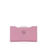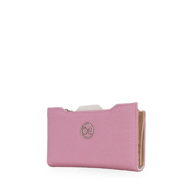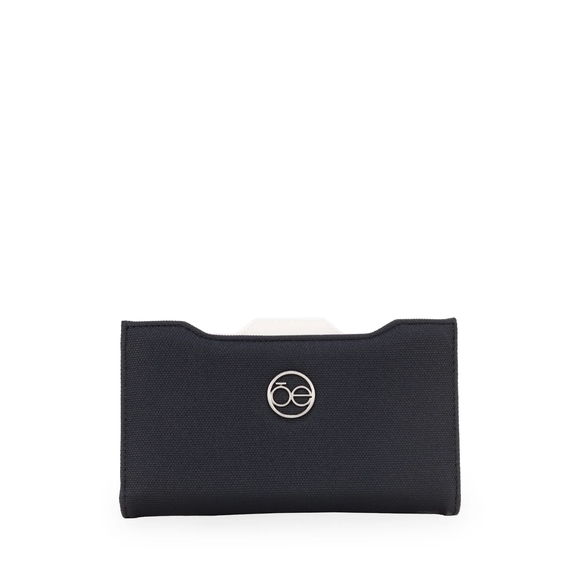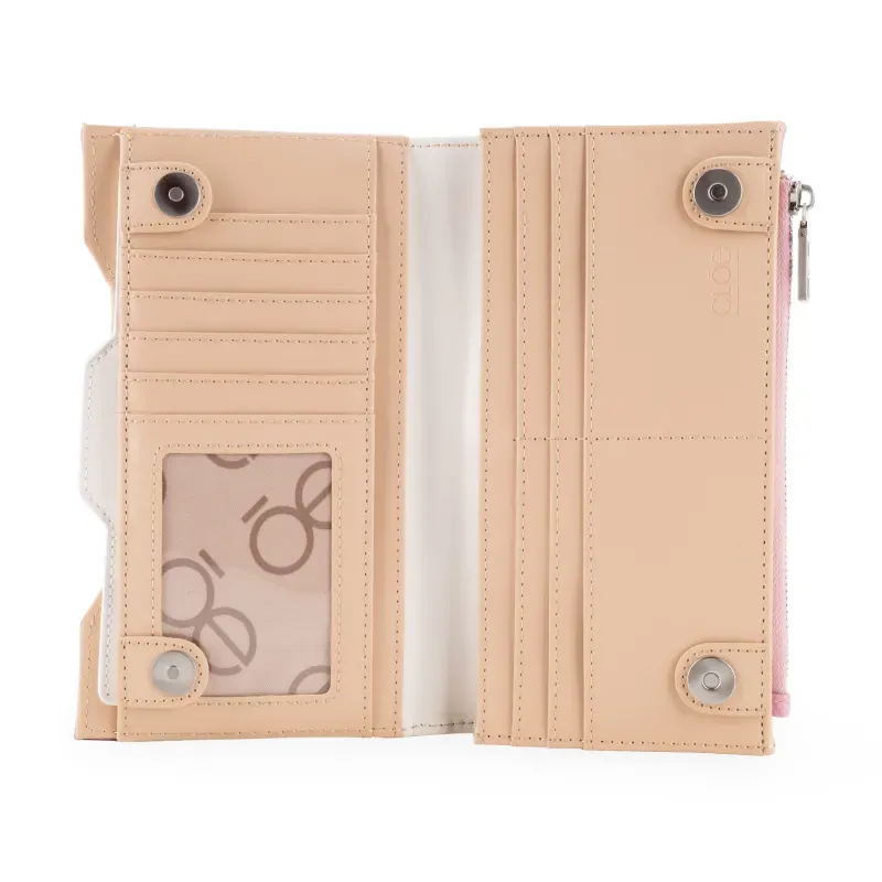 Billetera hecha con material vegano. Cuenta con broche de presión. Cierre metálico de larga duración. Herraje metálico de monograma. Tiene múltiples compartimientos internos para tarjetas y billetes.