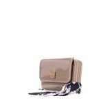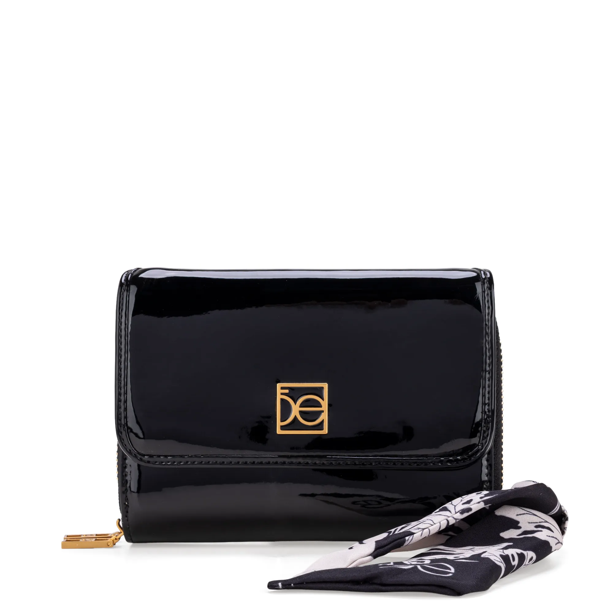 Billetera hecha con material vegano apariencia glossy. Cuenta con Broche magnético. Herraje de monograma. Mascada multiusos removible. Múltiples compartimentos internos para tarjeta y billetes.