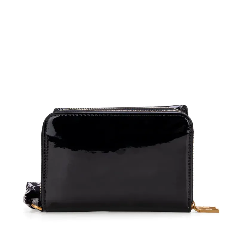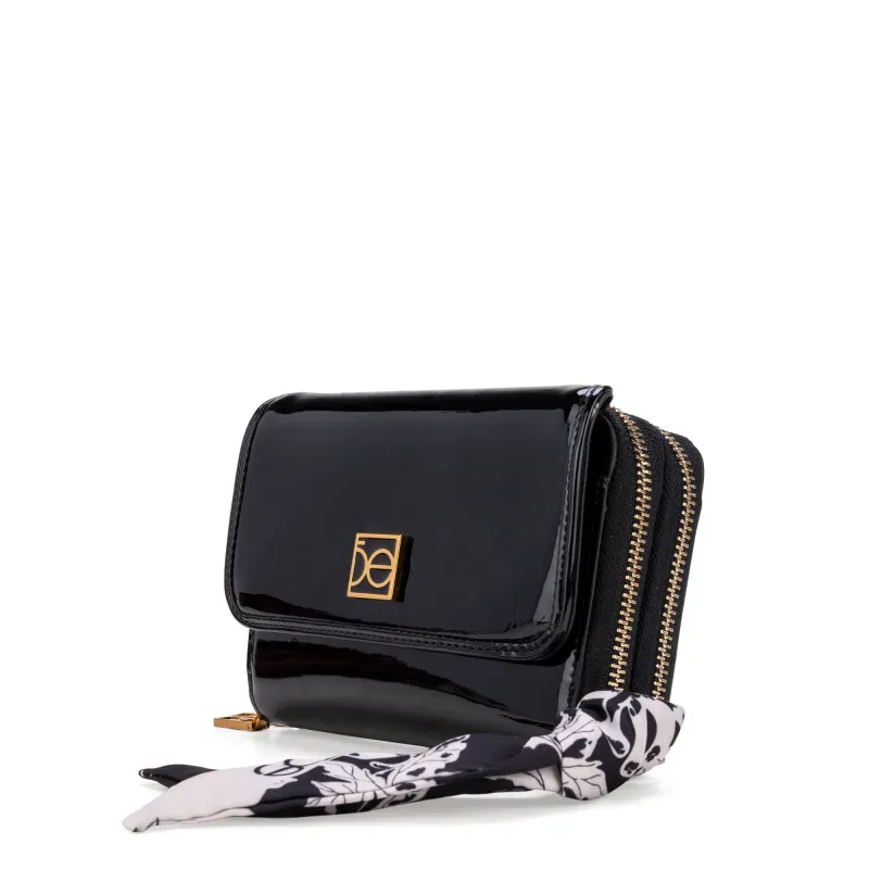 Billetera hecha con material vegano apariencia glossy. Cuenta con Broche magnético. Herraje de monograma. Mascada multiusos removible. Múltiples compartimentos internos para tarjeta y billetes.