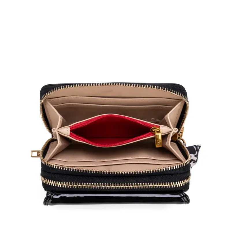 - Este producto tiene un RedPocket ®: Según antiguos preceptos orientales, el dinero debe resguardarse en una bolsa roja para conseguir abundancia y fortuna. Encuentra el RedPocket ® en todos nuestros productos, y la fortuna siempre estará contigo. - Material vegano apariencia glossy - Broche magnético - Herraje de monograma - Mascada multiusos removible - Múltiples compartimentos internos para tarjeta y billetes - 15.5 X 4 X 11 CM