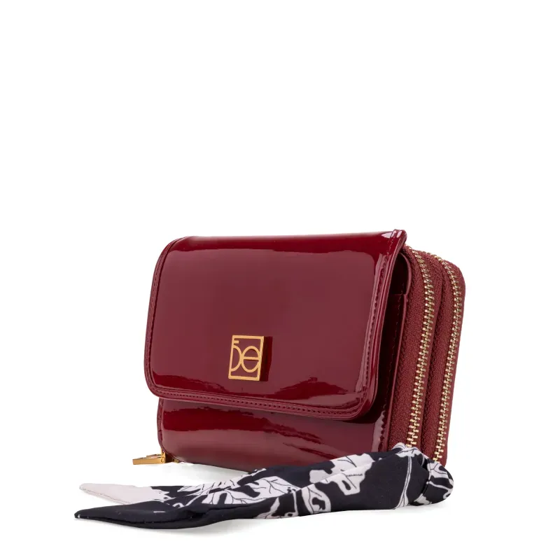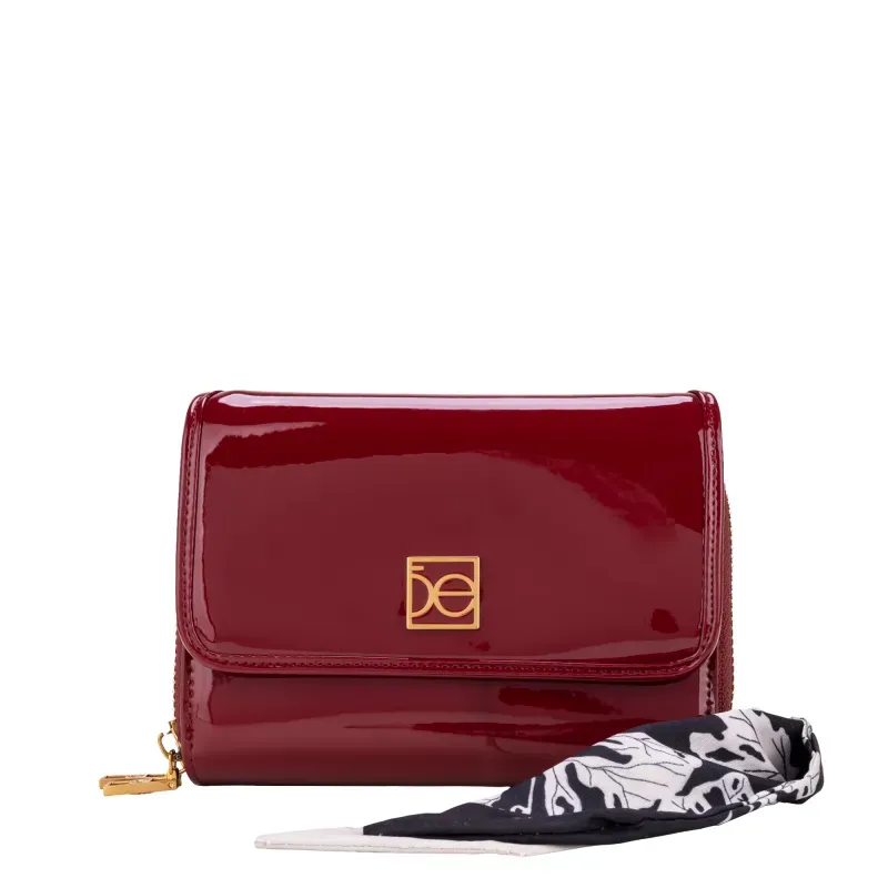Billetera hecha con material vegano apariencia glossy. Cuenta con Broche magnético. Herraje de monograma. Mascada multiusos removible. Múltiples compartimentos internos para tarjeta y billetes.