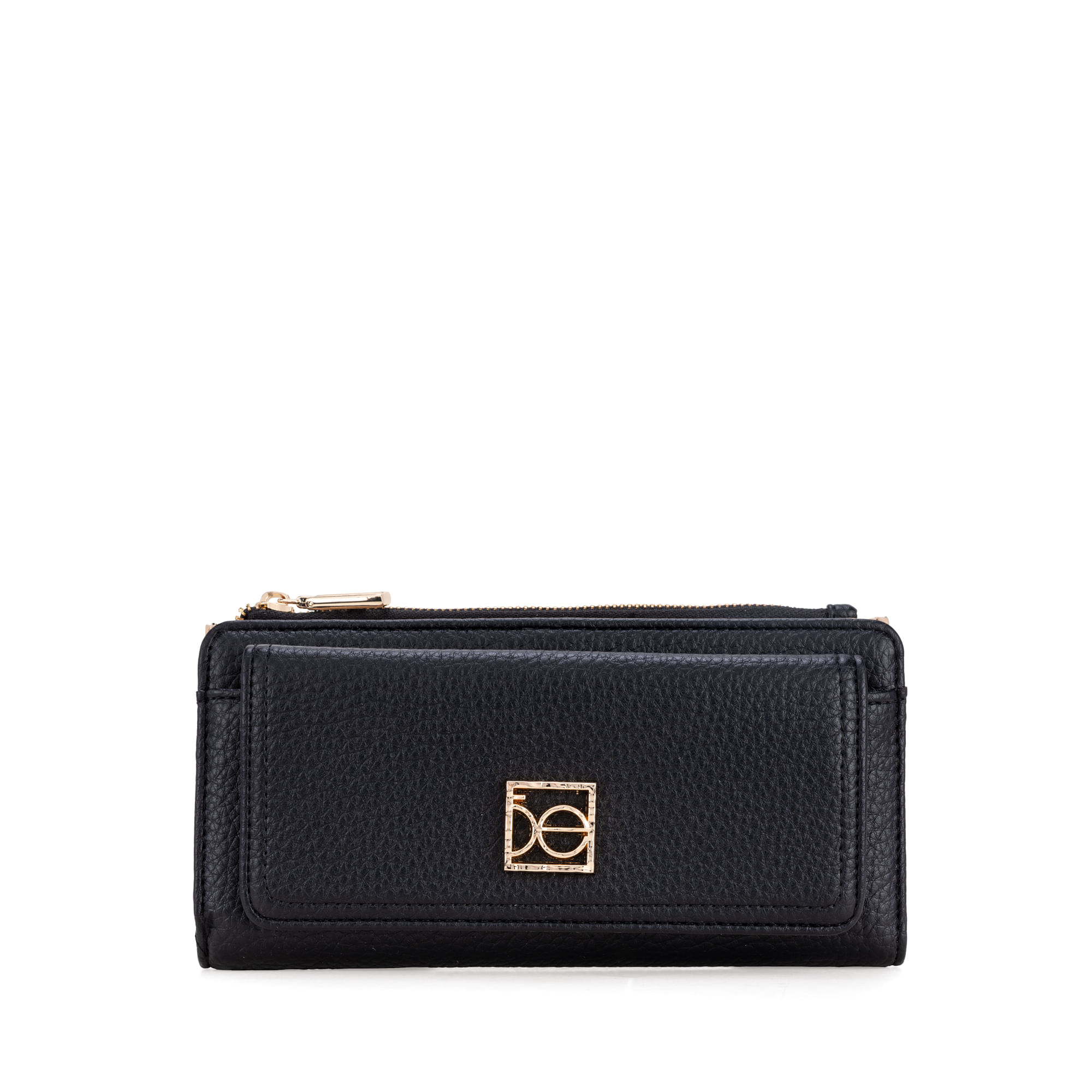 Billetera hecha con material vegano apariencia piel. Cuenta con cierre metálico de larga duración. Compartimento frontal con broche a presión. Compartimento posterior con cierre. Herraje de monograma. Monedero interno. Múltiples compartimentos internos para billetes y tarjetas.