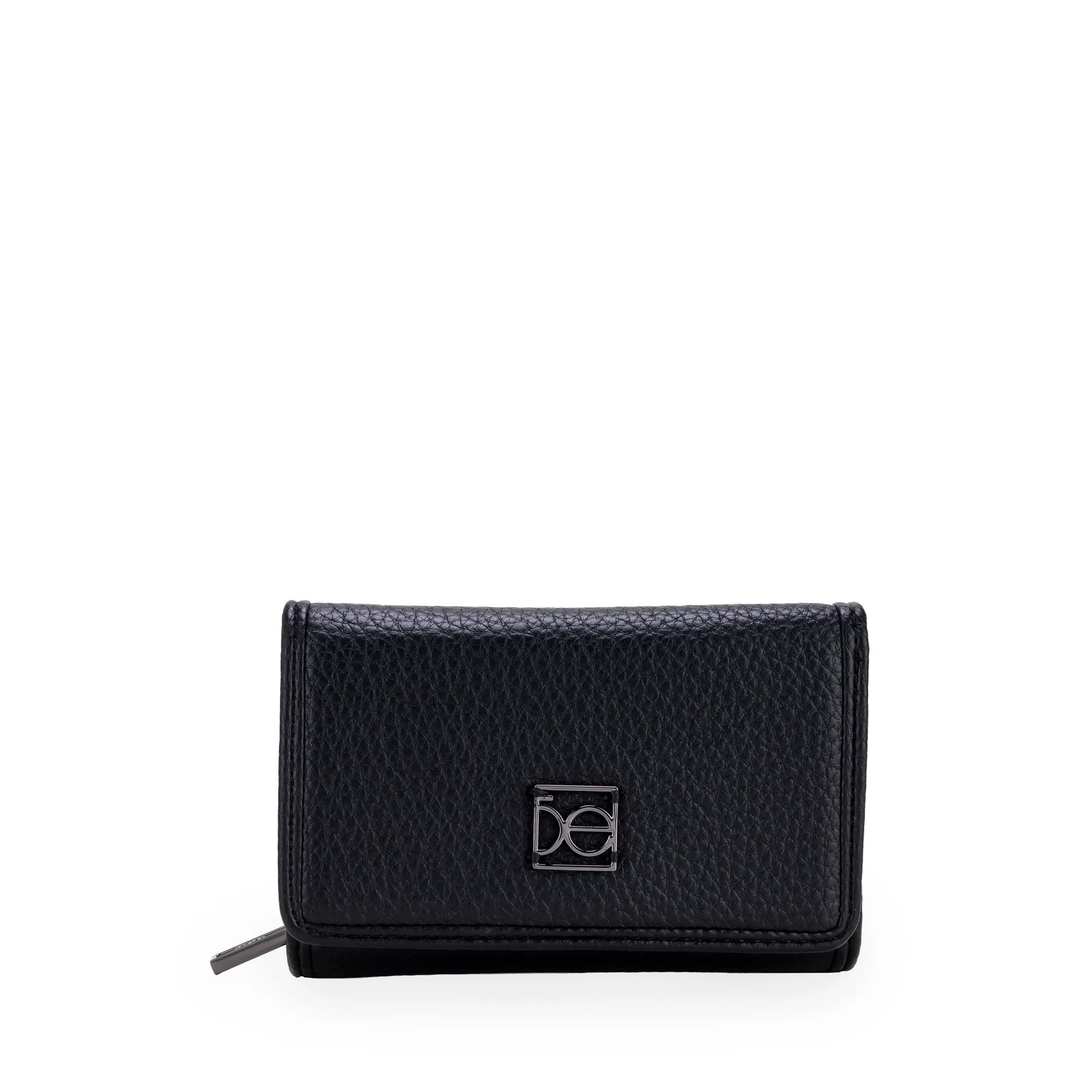Billetera hecha con material vegano. Cuenta con herraje de monograma. Cierre metálico de larga duración. Tiene múltiples compartimentos para tarjetas y billeta.
