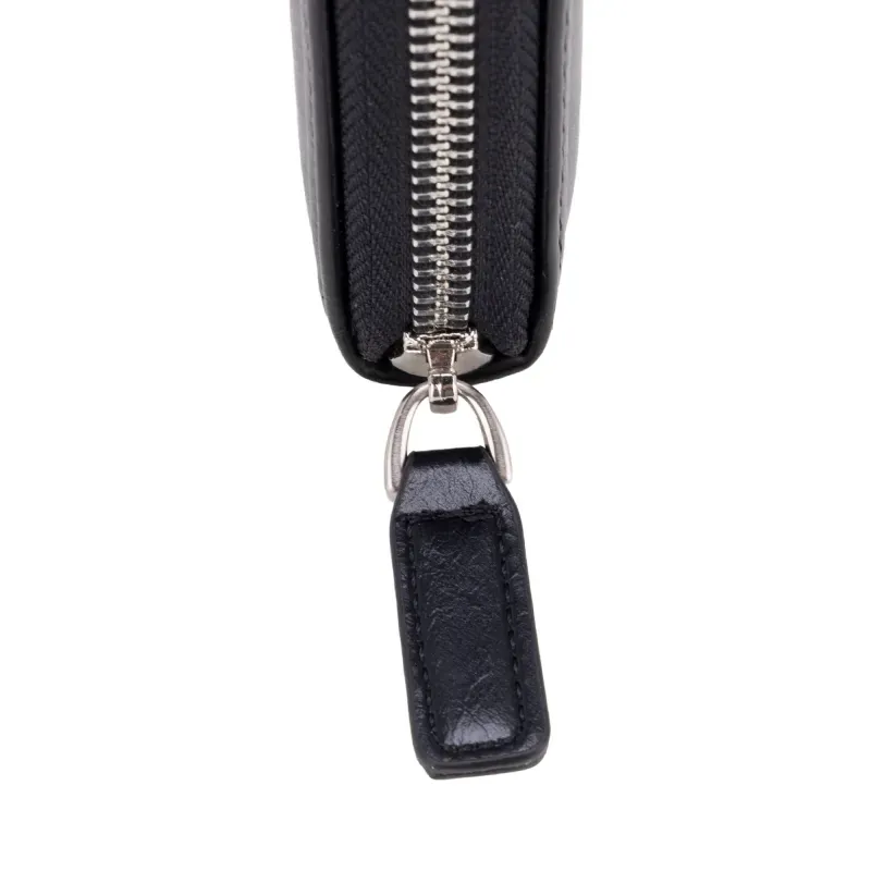 Billetera hecha con material vegano apariencia piel. Cuenta con cierre metálico de larga duración. Múltiples compartimientos internos. Tiene maneral lateral de fácil uso.