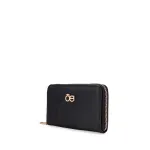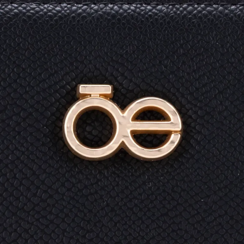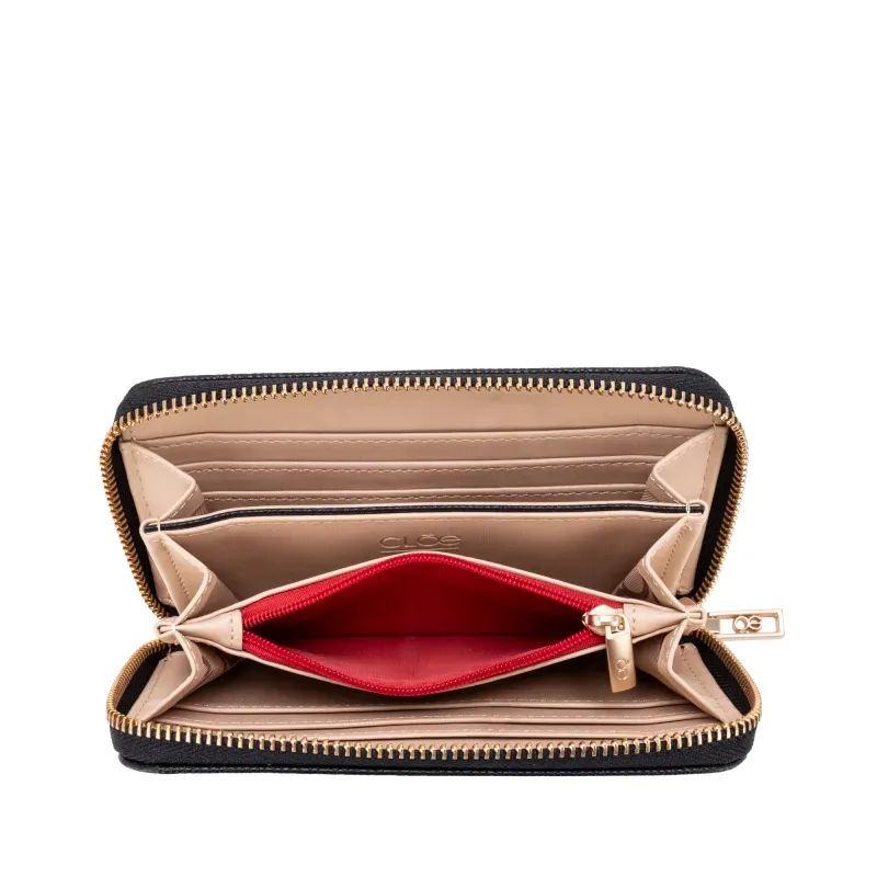 Billetera hecha con material vegano apariencia piel. Cuenta con cierre metálico de larga duración. Herraje metálico de monograma. Monedero interno. Múltiples compartimentos internos para tarjetas y billetes.