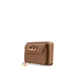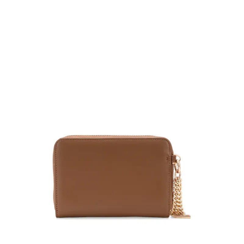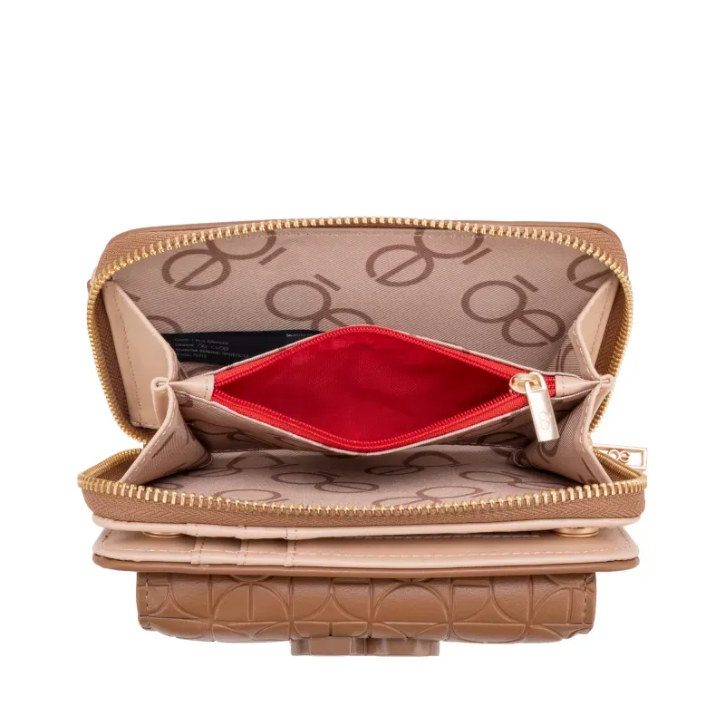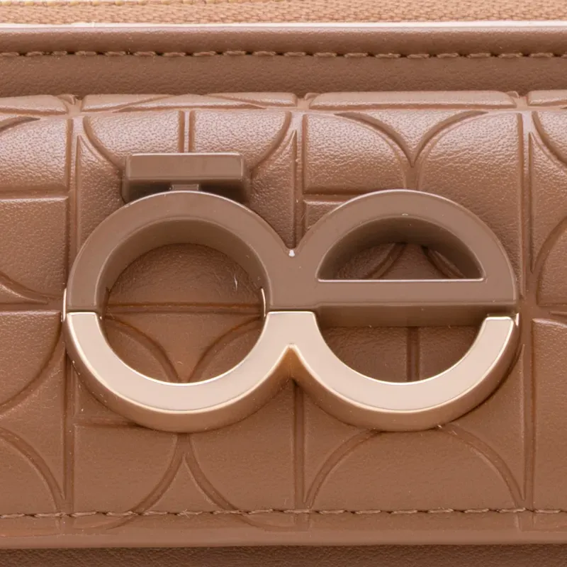 Billetera hecha con material vegano apariencia piel. Cuenta con cierre metálico de larga duración. Tiene herraje de monograma. Maneral lateral de fácil uso. Múltiples compartimentos internos para billetes y tarjetas.