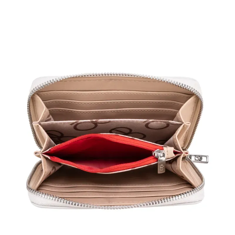 Billetera hecha con material vegano. Cuenta con cierre metálico de larga duración. Múltiples compartimientos internos para tarjetas y billetes. Tiene monograma en relieve.