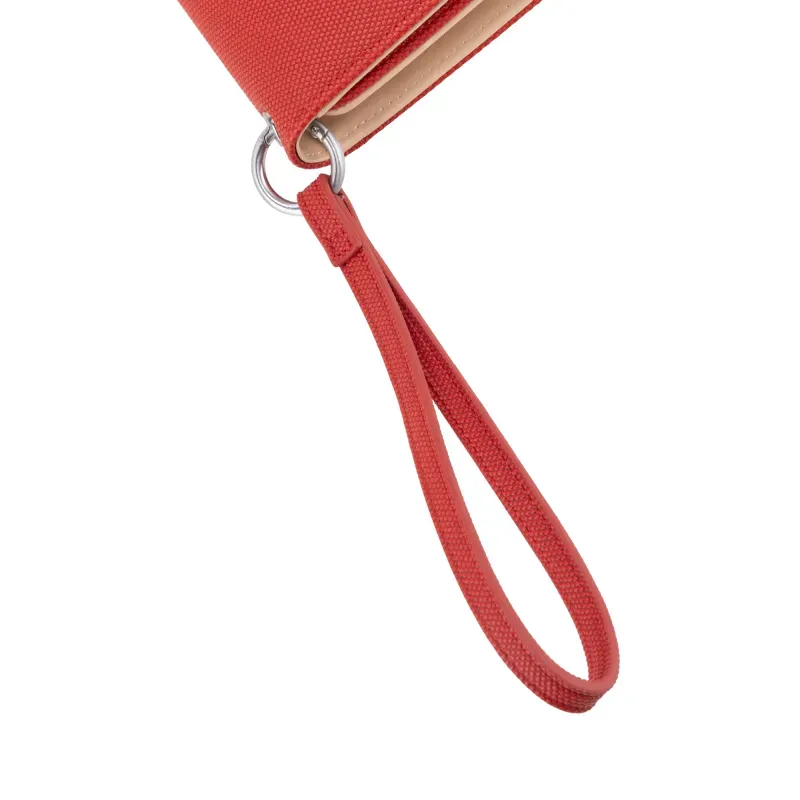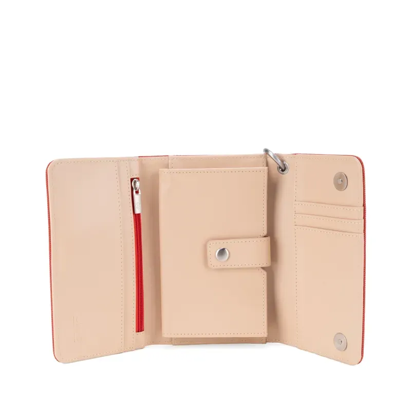 Billetera Flap hecha con material vegano apariencia textil. Cuenta con maneral de fácil uso desprendible. Tiene herraje metálico de larga duración. Múltiples compartimientos internos para billetes y tarjetas.
