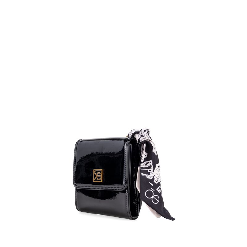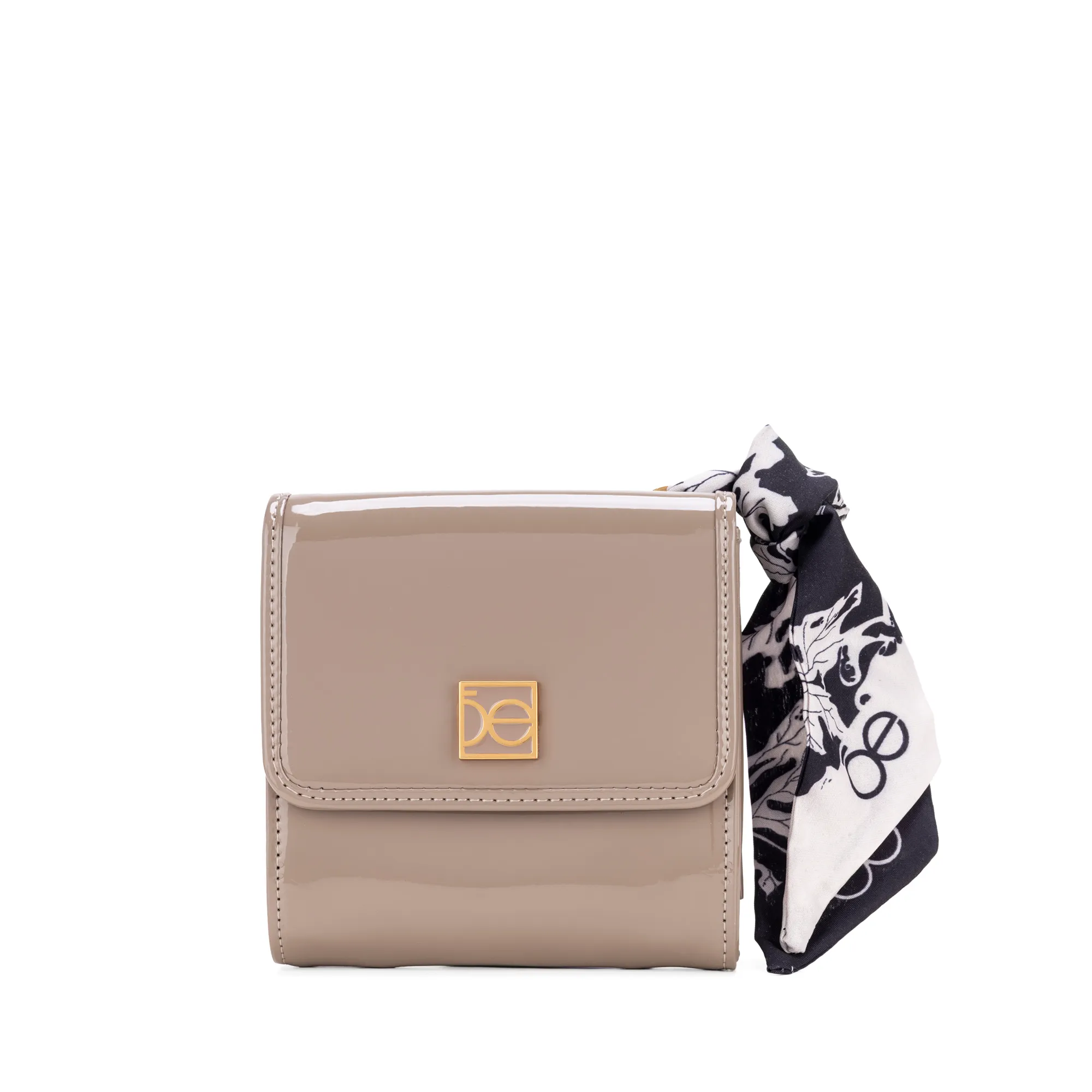 Billetera hecha con material vegano apariencia glossy. Cuenta con Broche magnético. Herraje de monograma. Mascada multiusos removible. Múltiples compartimentos internos.