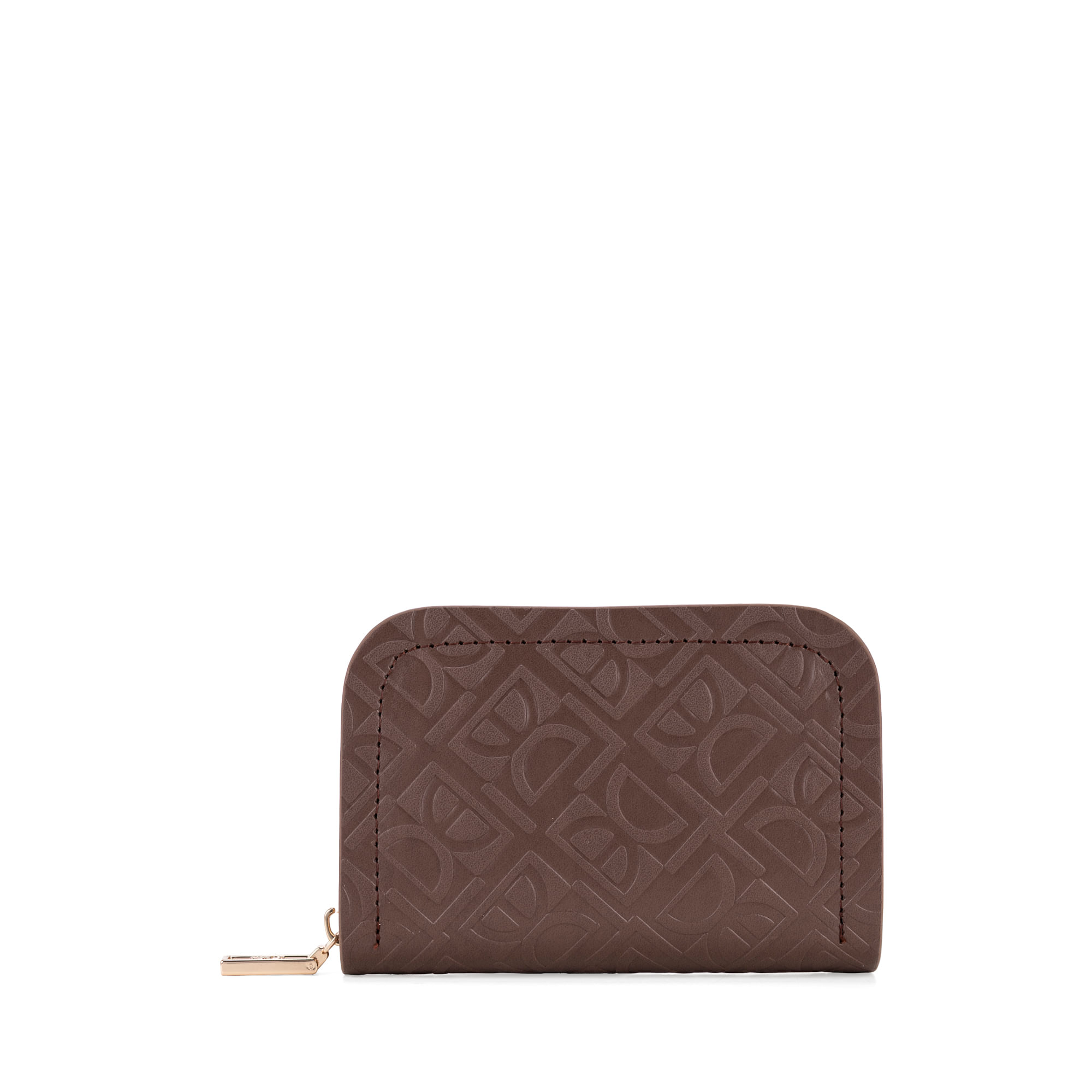Billetera hecha con material vegano apariencia piel. Cuenta con cierre metálico de larga duración. Look de monograma de alto relieve. Compartimentos internos. Monedero interno.