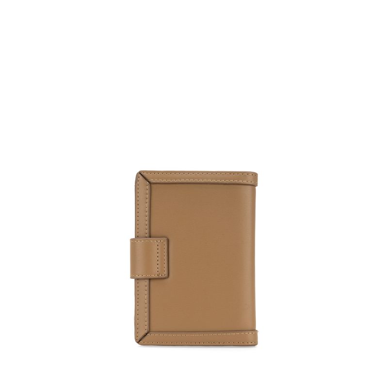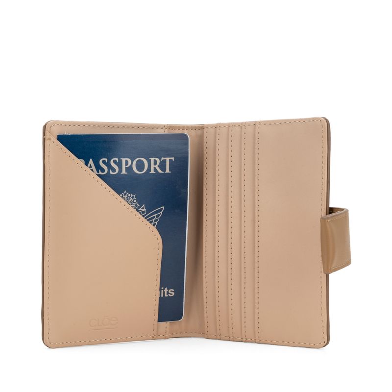 Billetera Porta Pasaporte hecha con material vegano apariencia piel. Cuenta con herraje metálico de monograma. Múltiples compartimentos internos para tarjetas. Tiene un compartimento para guardar pasaporte.