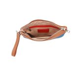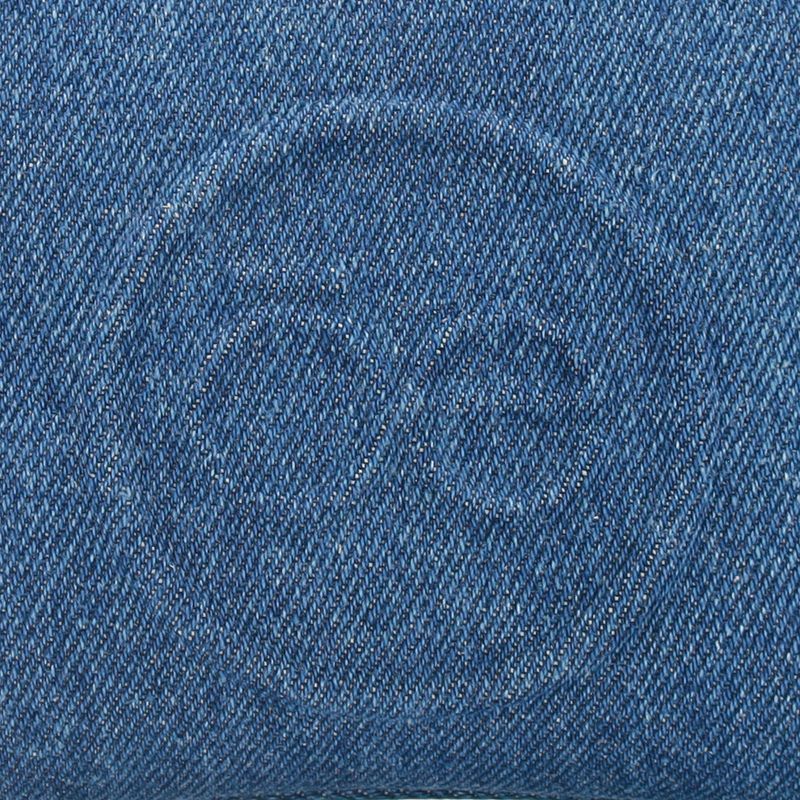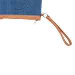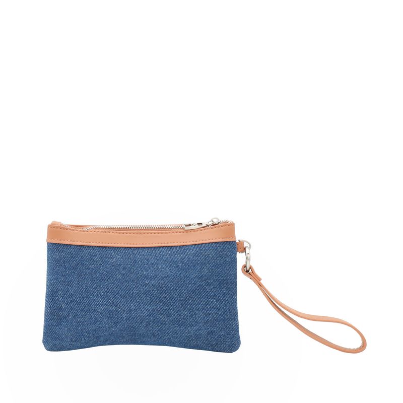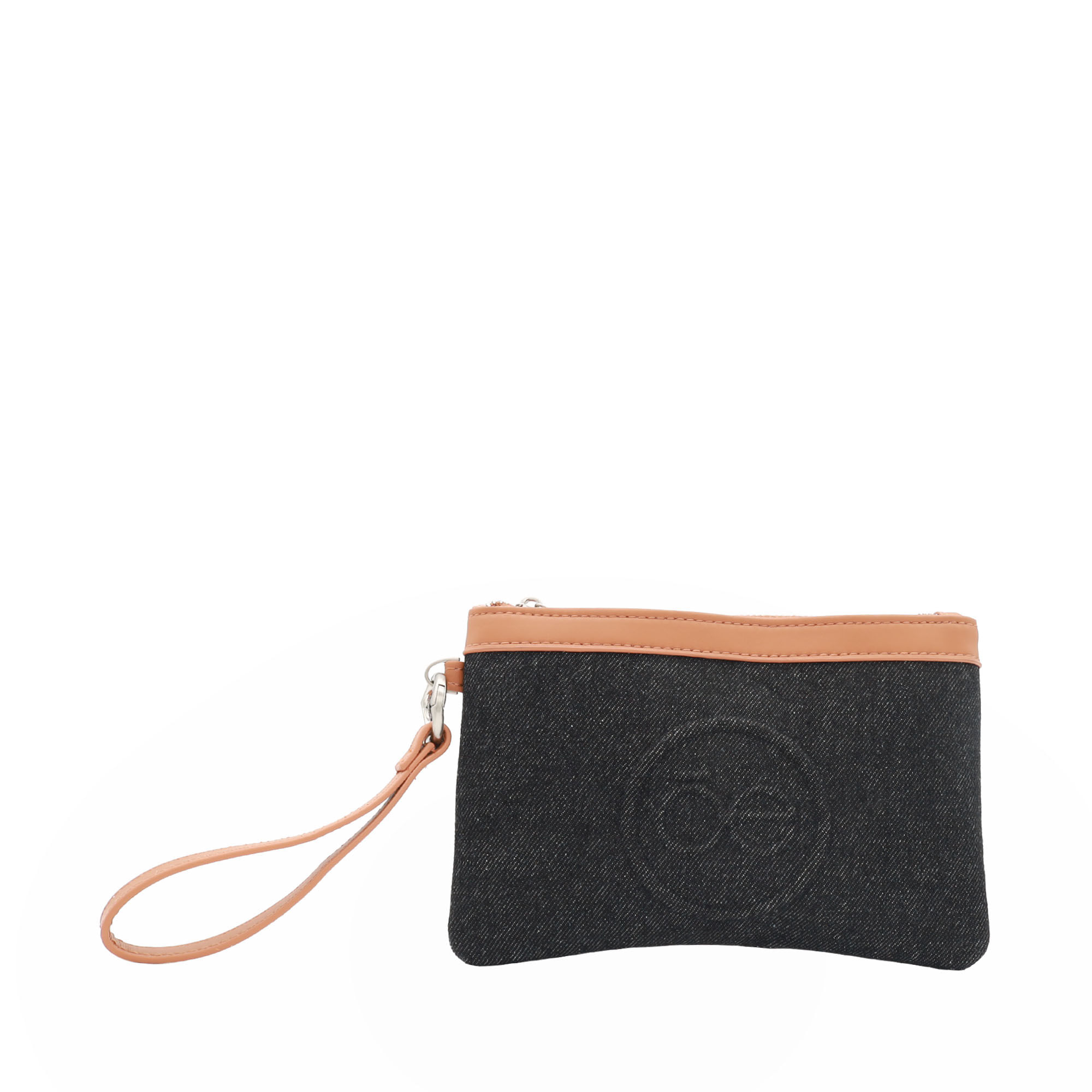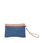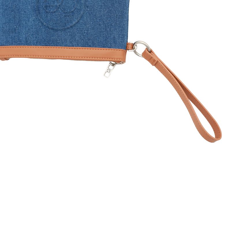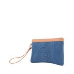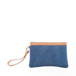 Billetera tipo pouch hecha con material denim. Cuenta con cierre metálico de larga duración. Tiene monograma en alto relieve. Maneral lateral de fácil uso.