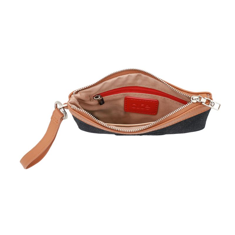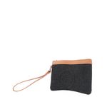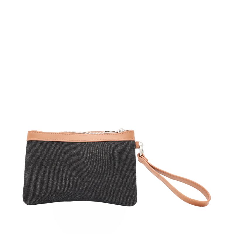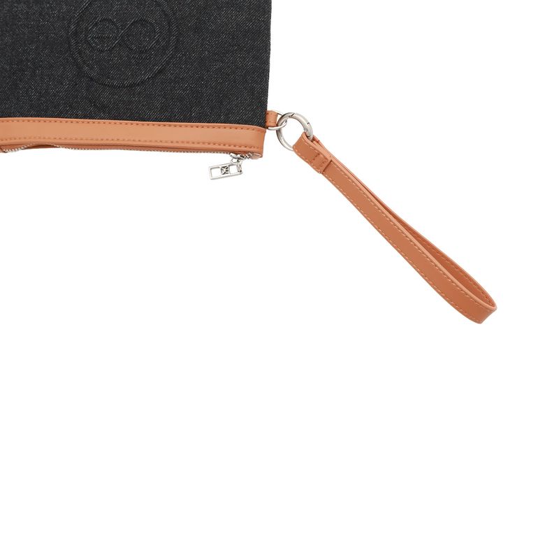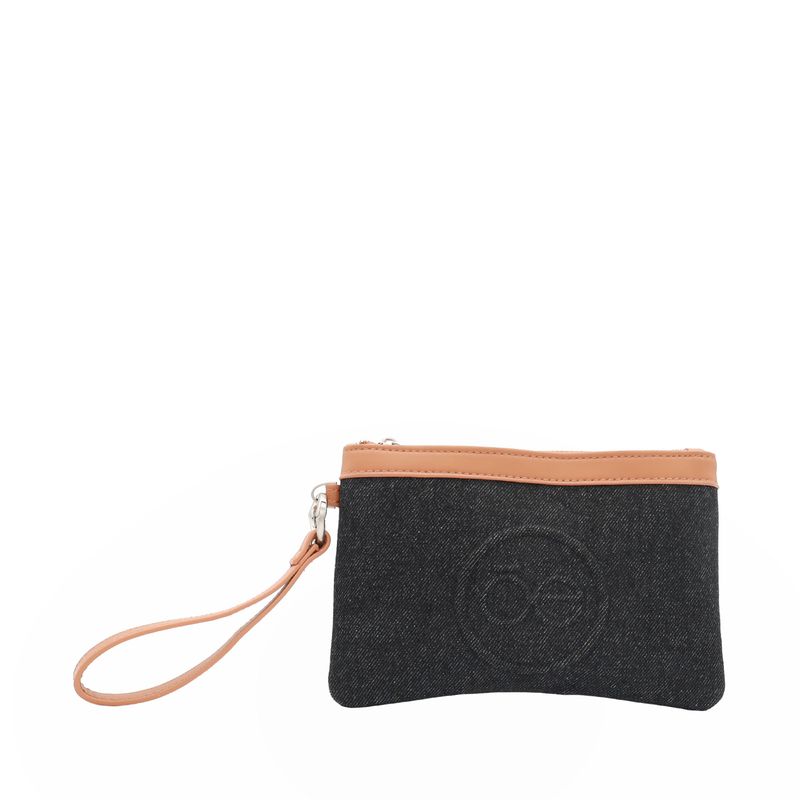 Billetera tipo pouch hecha con material denim. Cuenta con cierre metálico de larga duración. Tiene monograma en alto relieve. Maneral lateral de fácil uso.