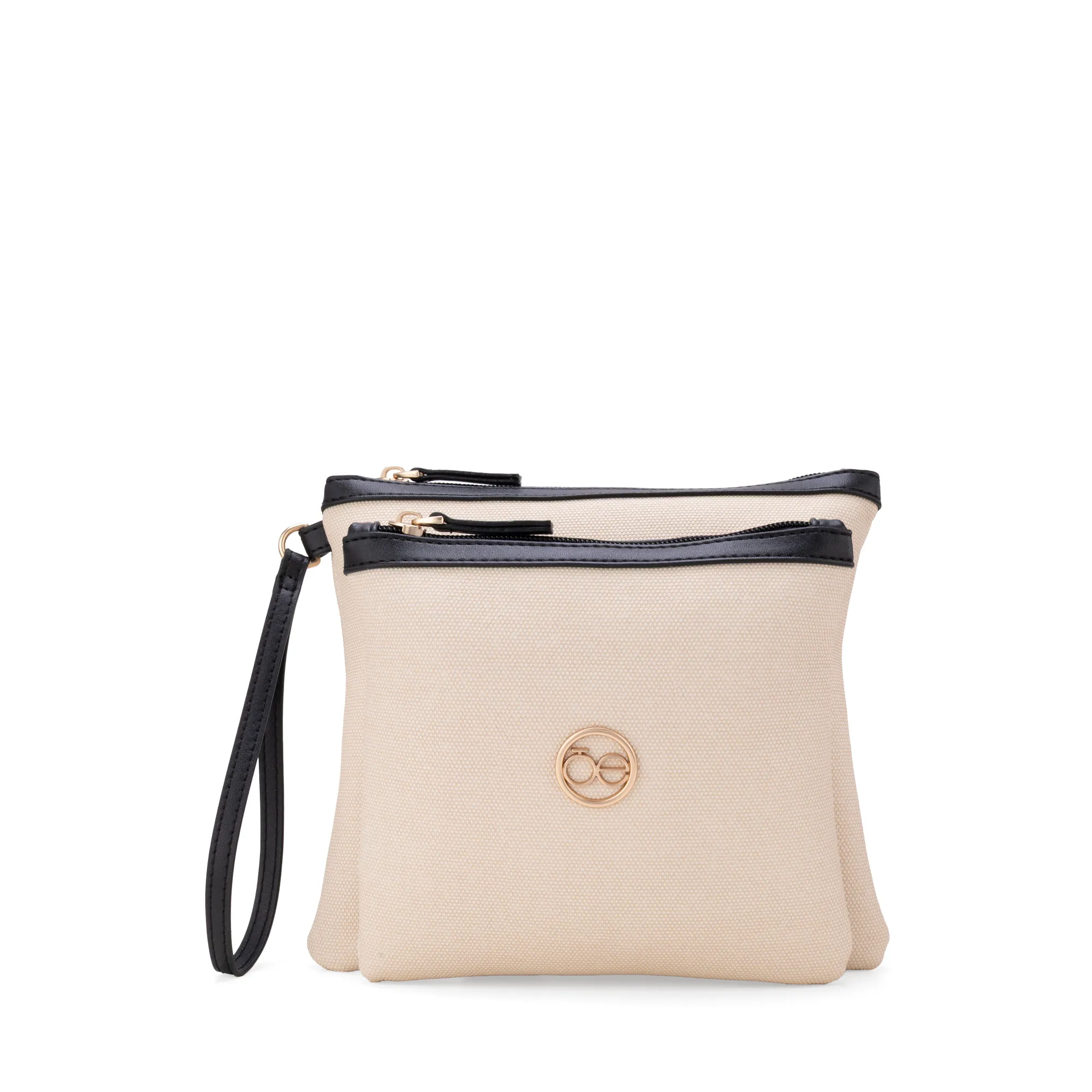 Cosmetiquera hecha con material vegano look textil. Cuenta con maneral lateral de fácil uso. Tiene herraje metálico de monograma.