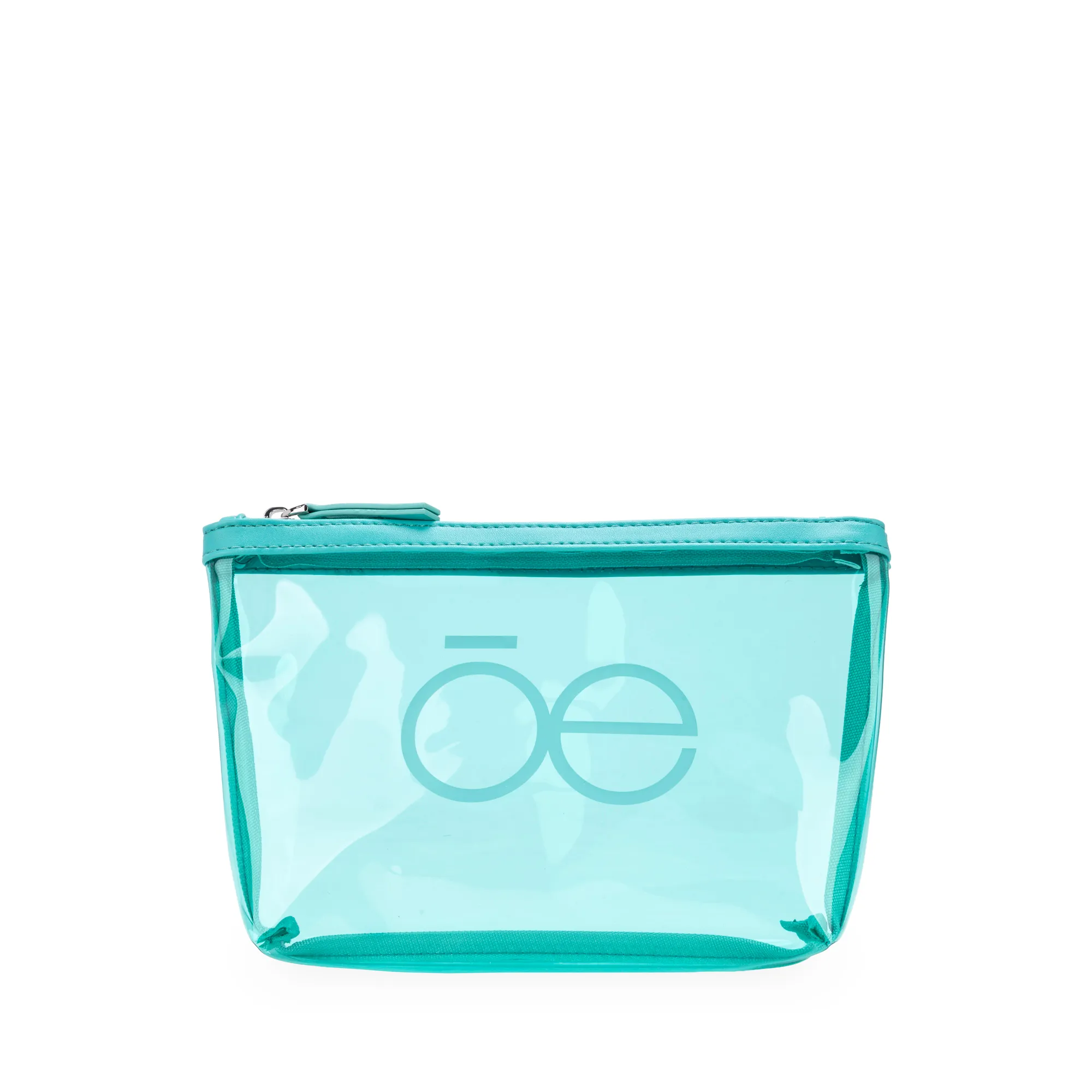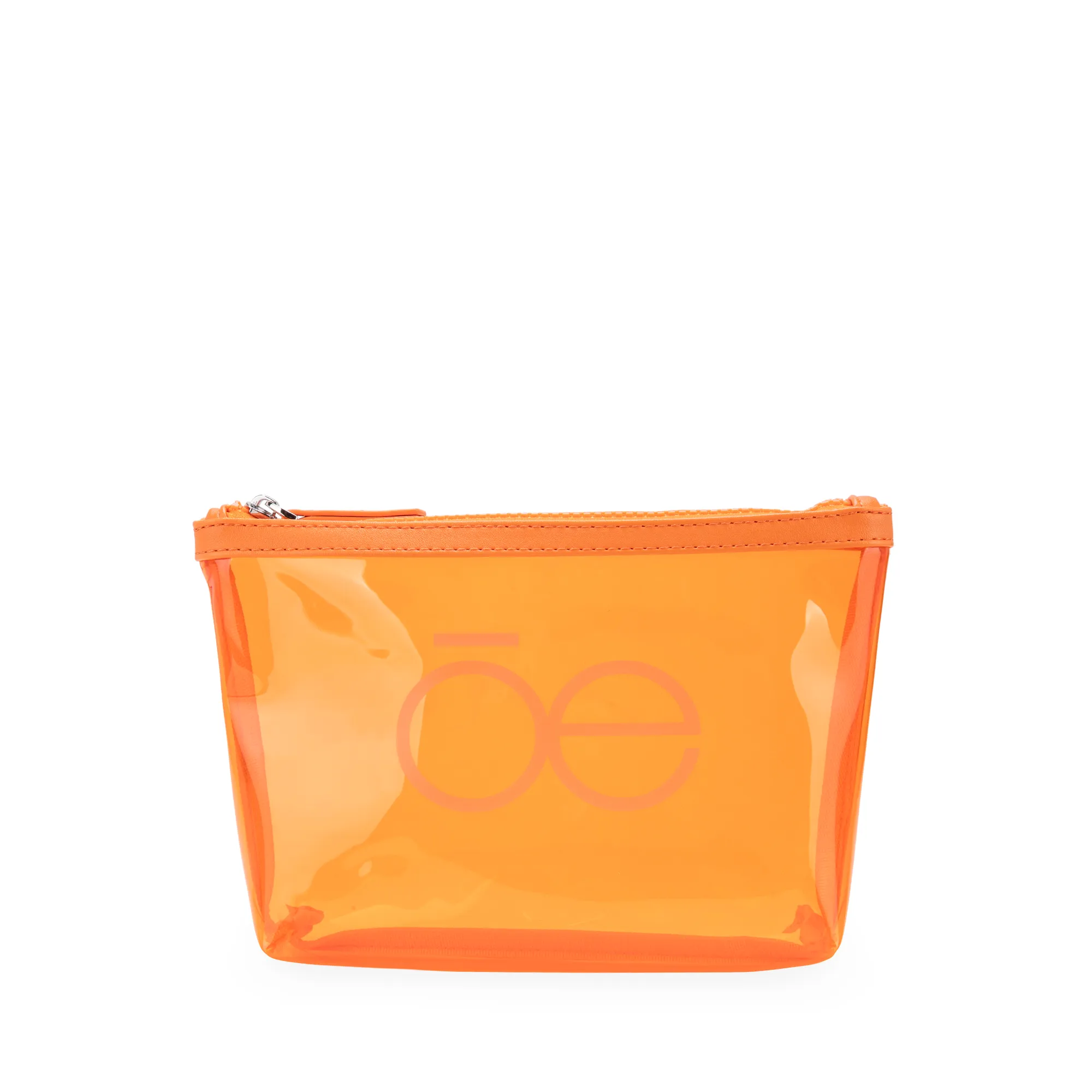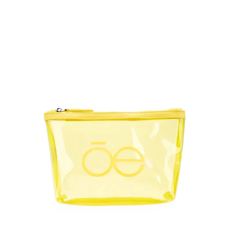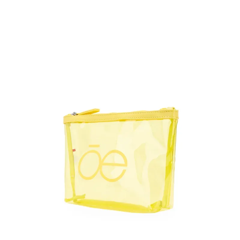 Cosmetiquera hecha con material mica. Cuenta con cierre sencillo. Estampado de monograma.