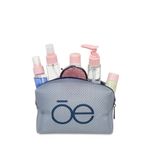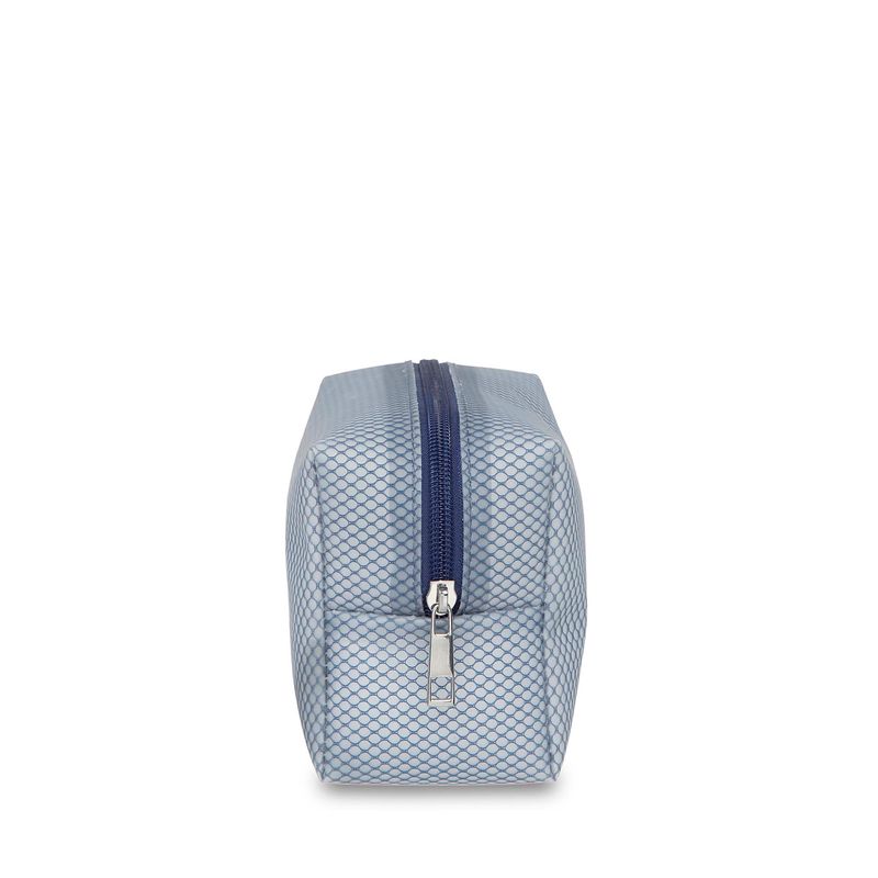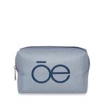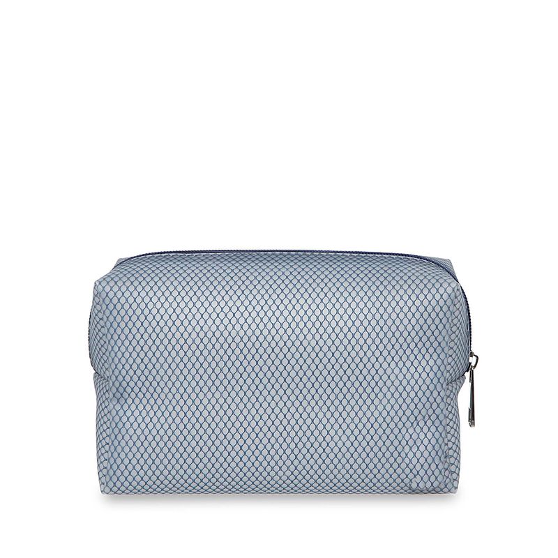 Cosmetiquera hecha con material mica, diseño tipo red. Tiene cierre de larga duración. Cuenta con estampado de monograma. Capacidad mediana de almacenaje.