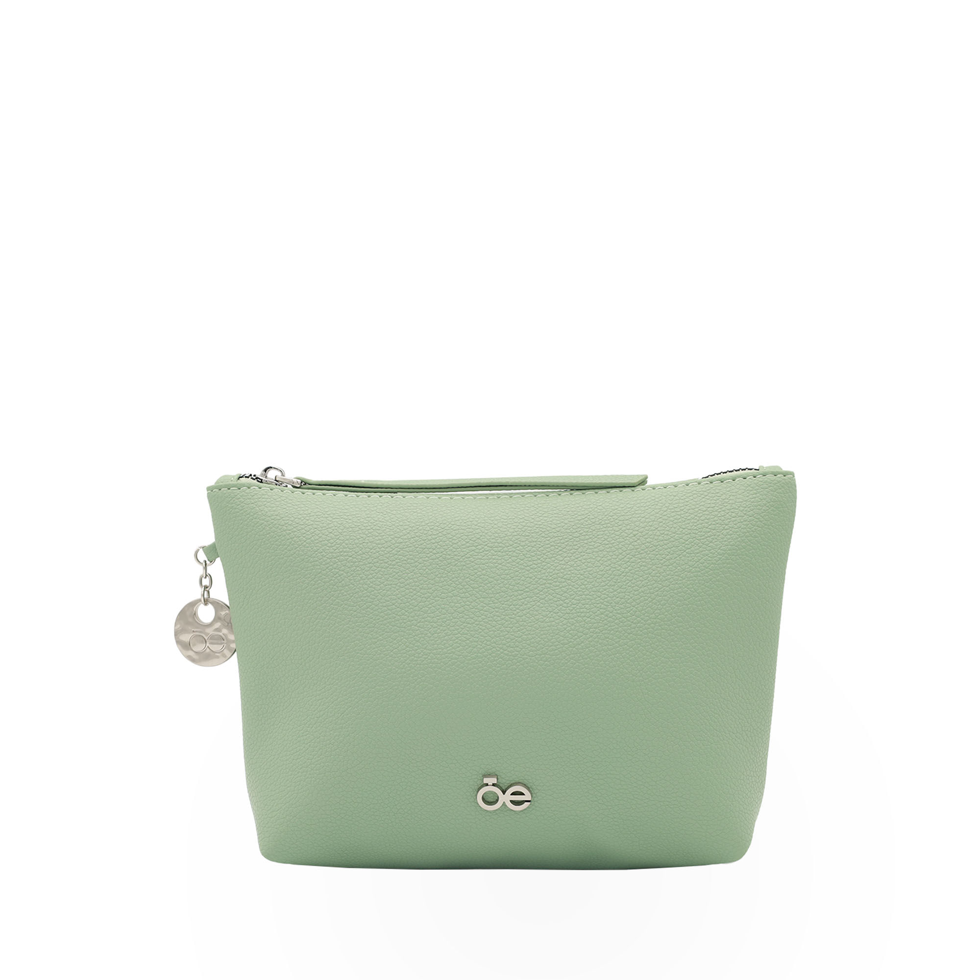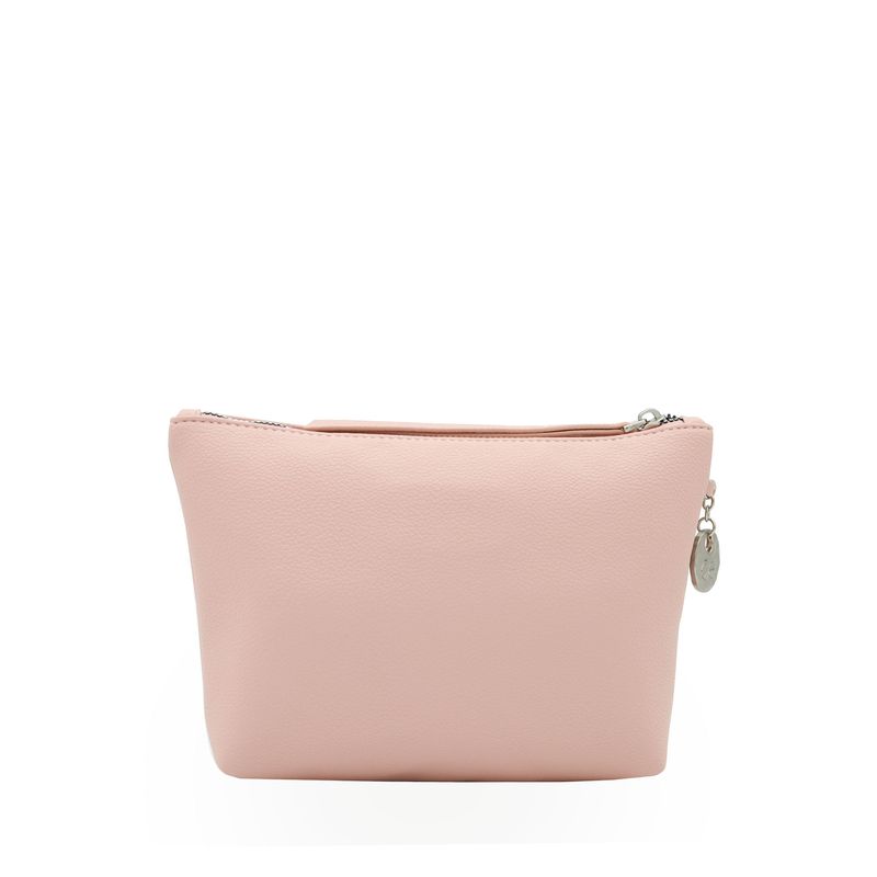 Cosmetiquera hecha con material vegano apariencia piel. Cuenta con cierre de larga duración. Tiene herraje metálico de monograma. Charm decorativo. Capacidad mediana de almacenaje.