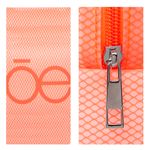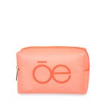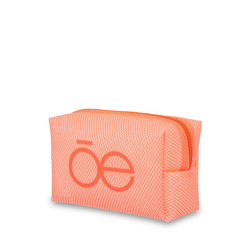 Cosmetiquera hecha con material mica, diseño tipo red. Tiene cierre de larga duración. Cuenta con estampado de monograma. Capacidad mediana de almacenaje.
