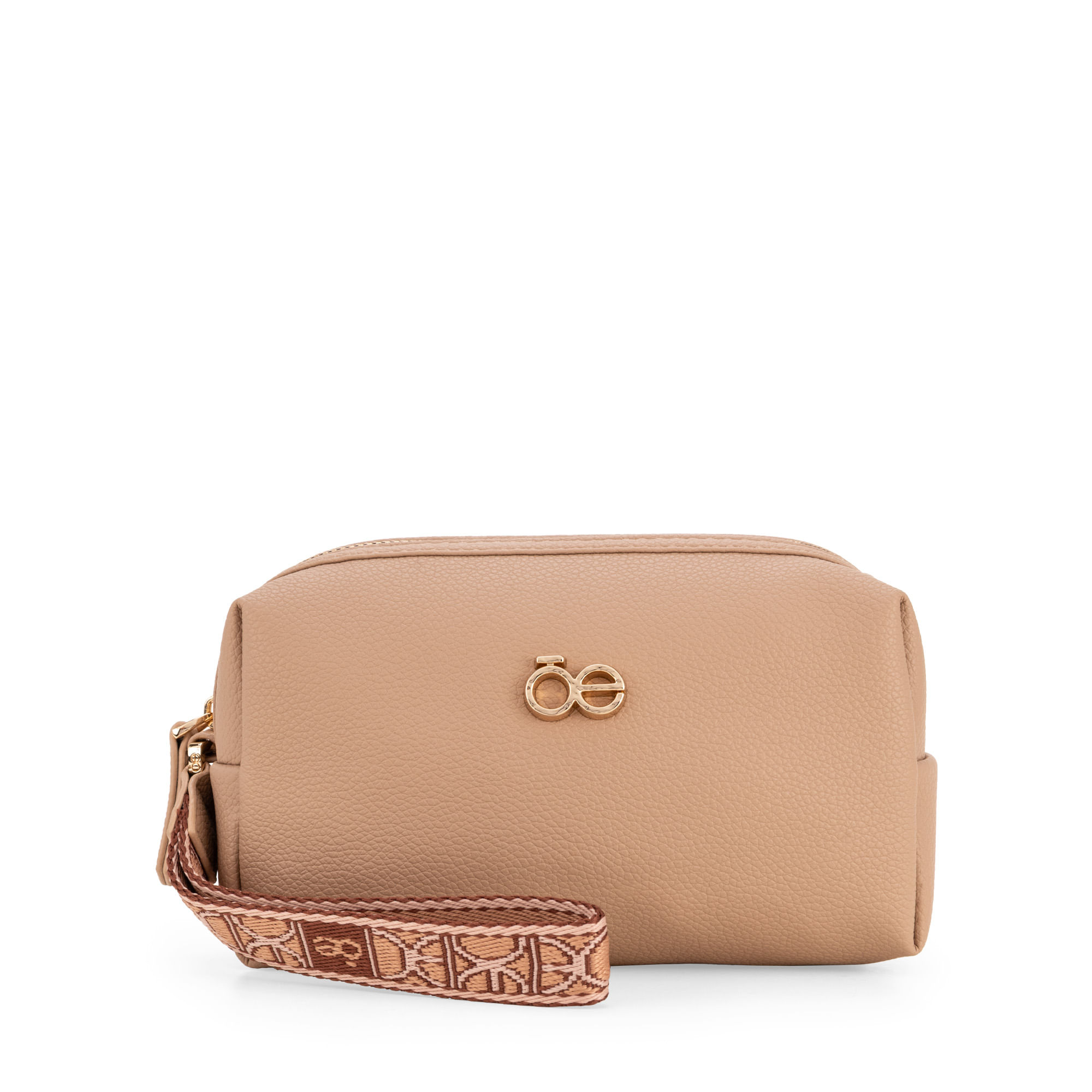 Cosmetiquera hecha con material vegano apariencia piel. Cuenta con cierre metálico de larga duración. Herraje metálico de monograma. Maneral lateral de fácil uso.