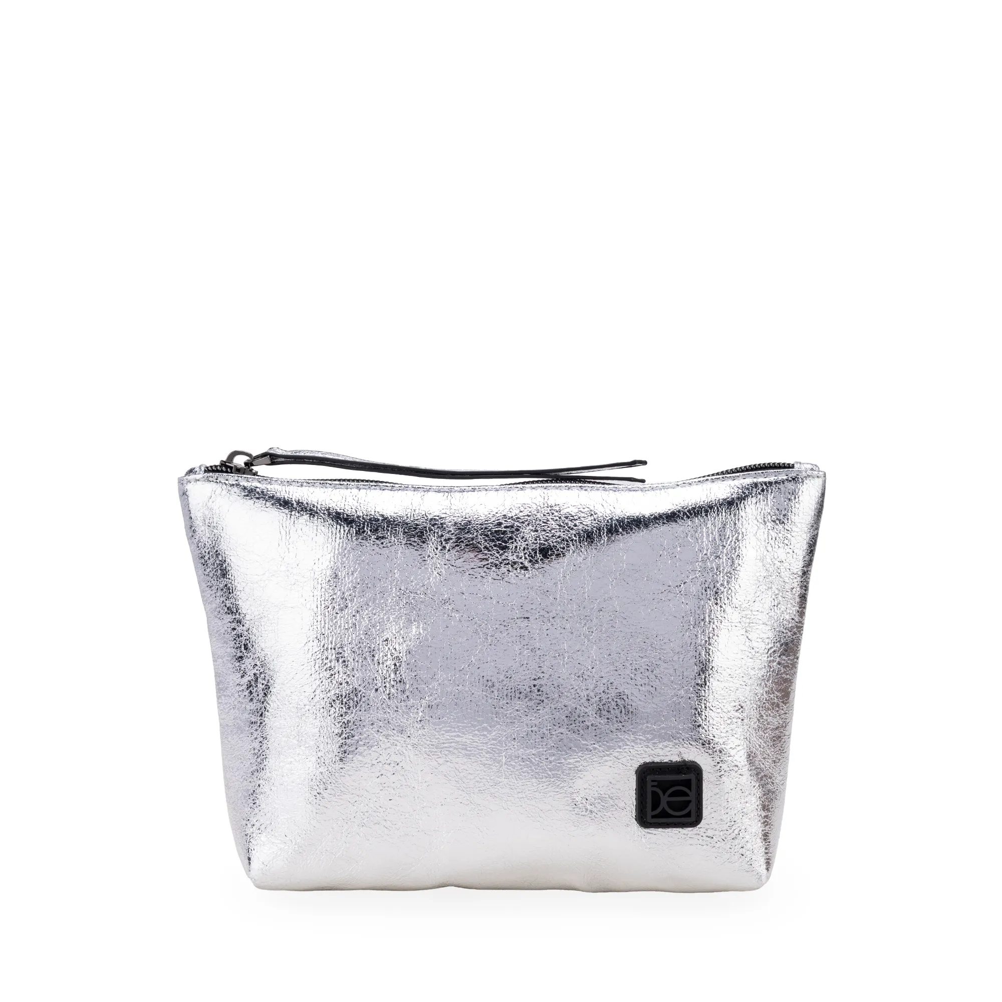 Cosmetiquera hecha con material vegano apariencia piel con acabado metálico. Cuenta con cierre de larga duración. Rubber de monograma. Capacidad de almacenamiento mediana.
