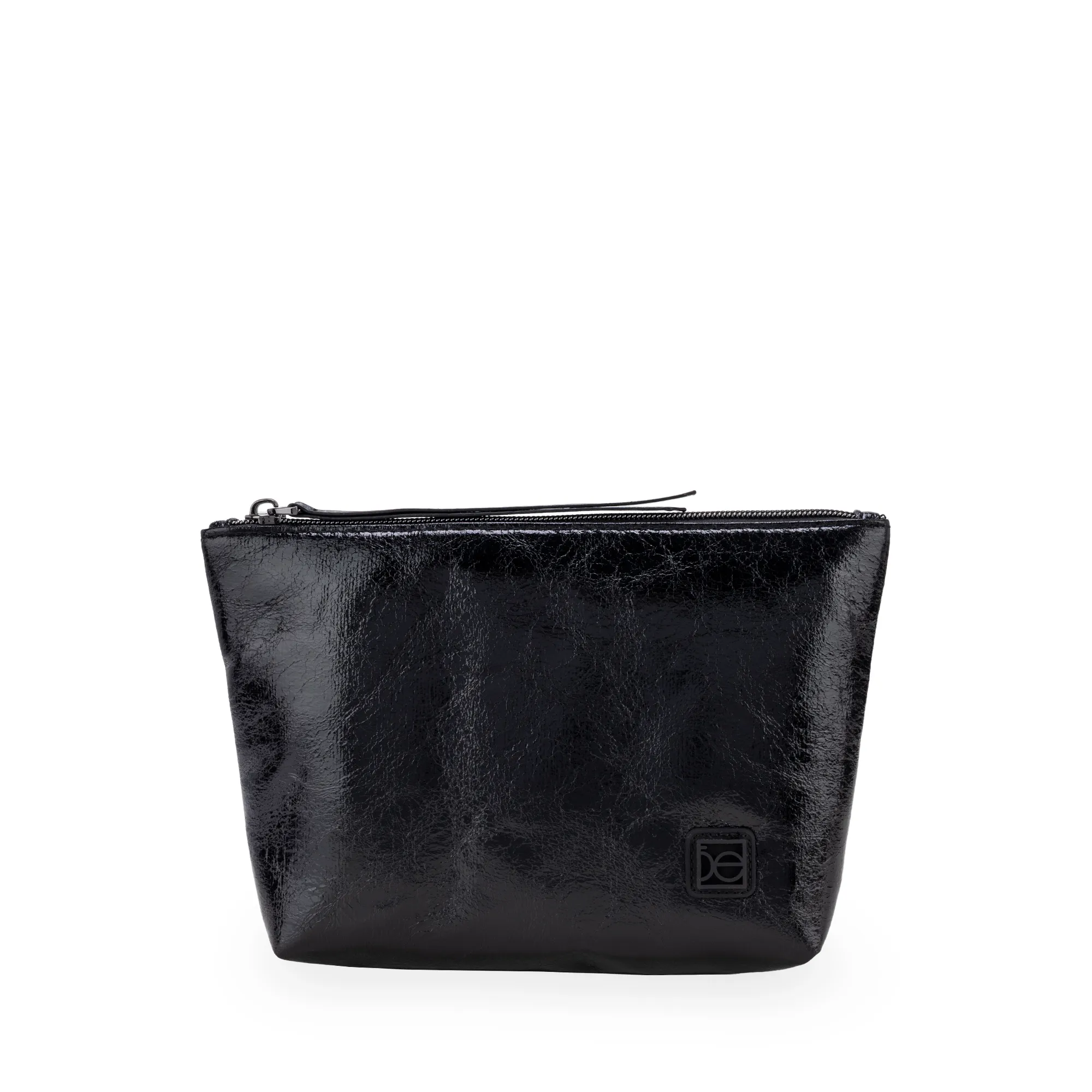 Cosmetiquera hecha con material vegano apariencia piel con acabado metálico. Cuenta con cierre de larga duración. Rubber de monograma. Capacidad de almacenamiento mediana.
