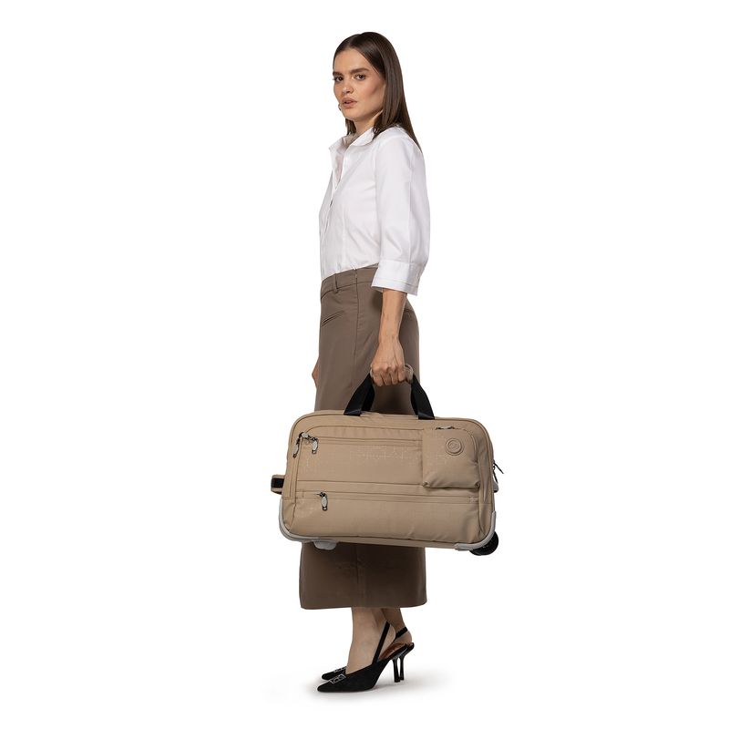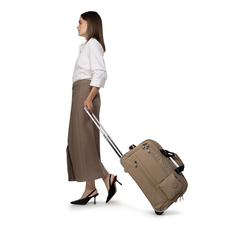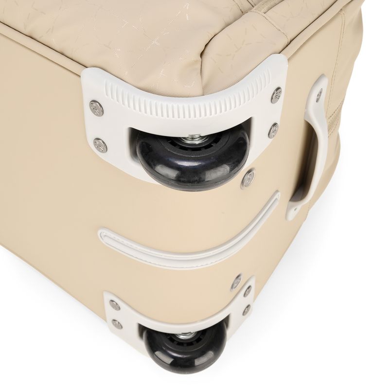 Duffle Bag hecha con material textil con estampado glossy. Cuenta con cierres de larga duración. Tiene rubber de monograma. Bastón de tres alturas. Cosmetiquera interna desprendible. Cuenta con dos ruedas silenciosas de fácil uso.