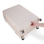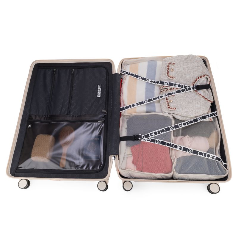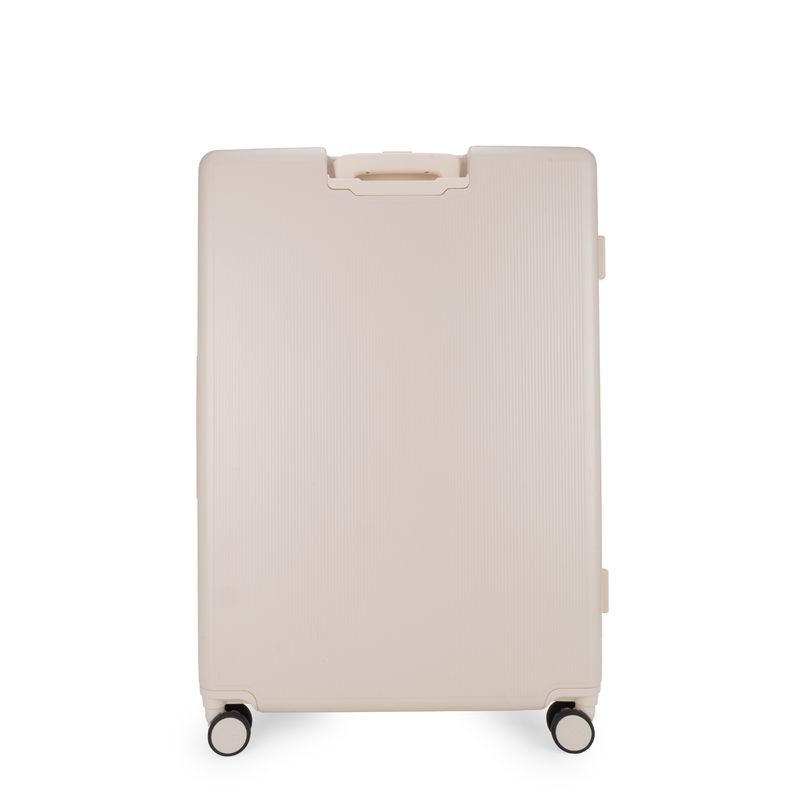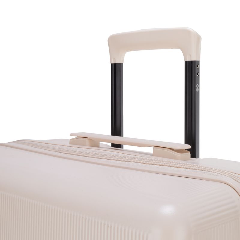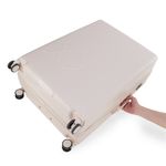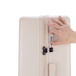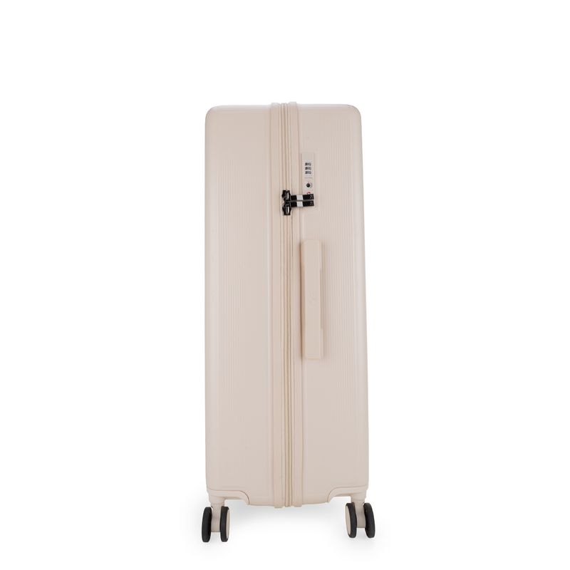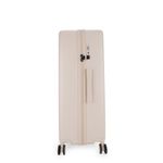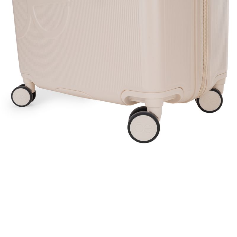 Equipaje vertical hecho con material policarbonato rígido. Cuenta con candado por combinación de seguridad TSA. Tiene ligero bastón de dos alturas. Cuatro ruedas dobles giratorias con movimiento 360°. Incluye funda textil protectora.