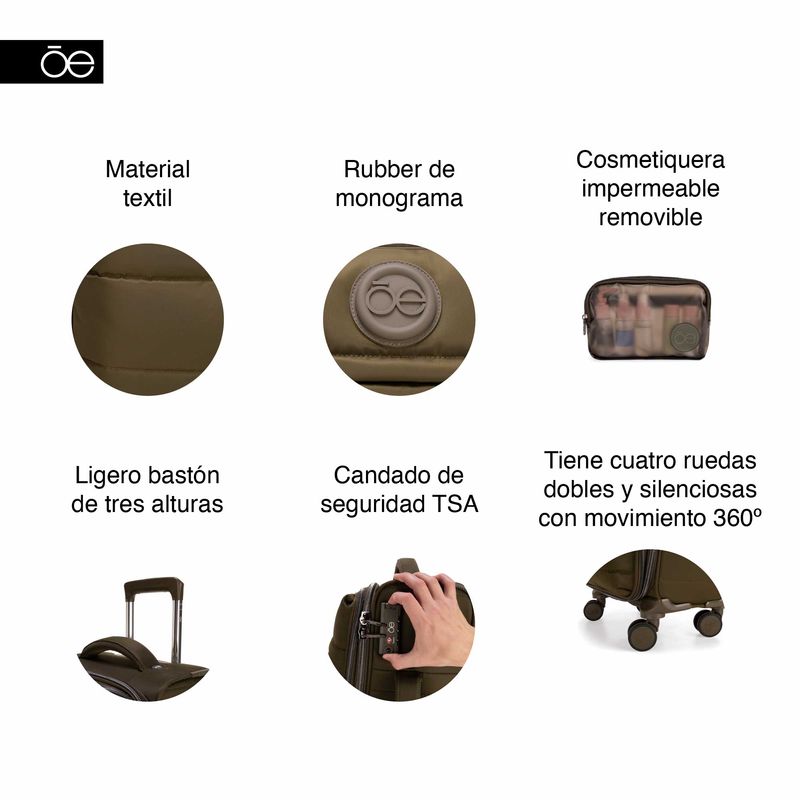 Equipaje hecho con material textil. Cuenta con compartimentos externos con cierre. Candado de seguridad TSA. Cuenta con cuatro ruedas dobles giratorias con movimiento 360°. Expandible. Bastón de tres alturas. Cosmetiquera impermeable desprendible.