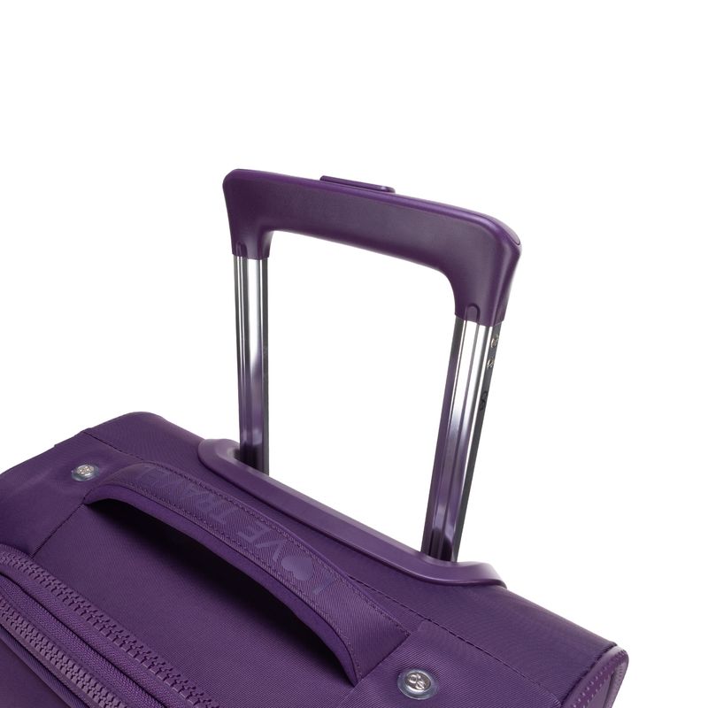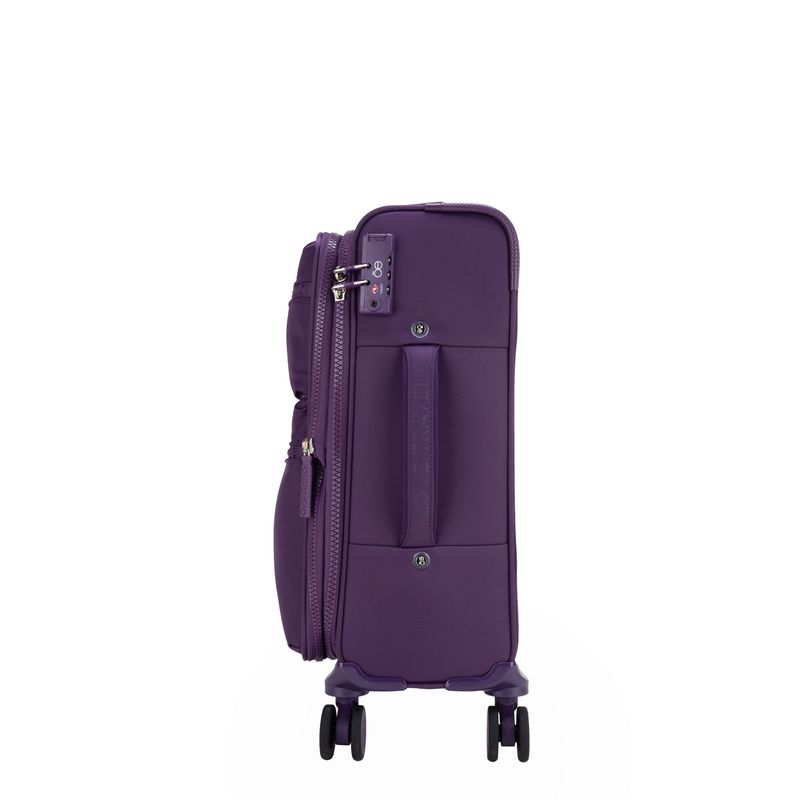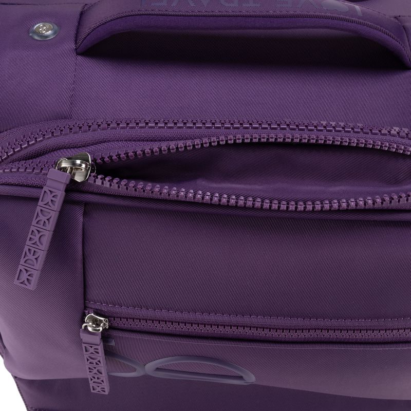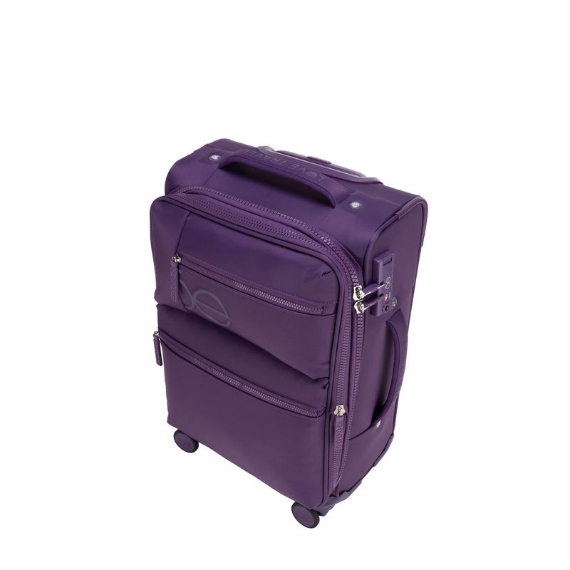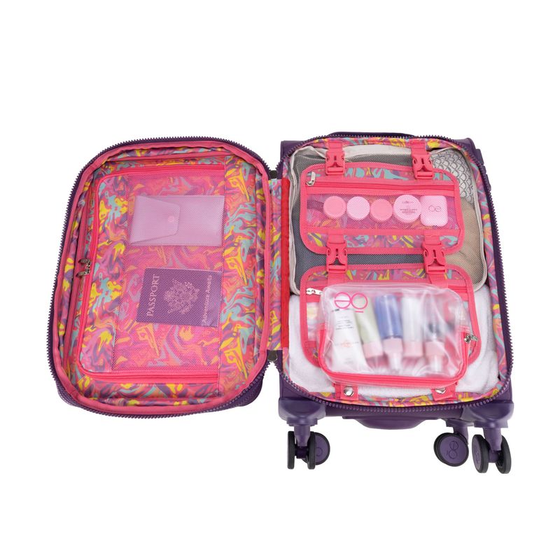 Equipaje hecho con material textil resistente. Cuenta con múltiples compartimentos frontales con cierre. Organizador desprendible. Cosmetiquera impermeable removible. Bastón de tres alturas. Cuatro ruedas dobles y silenciosas, con movimiento 360º. Expandible. Cerradura por combinación TSA.
