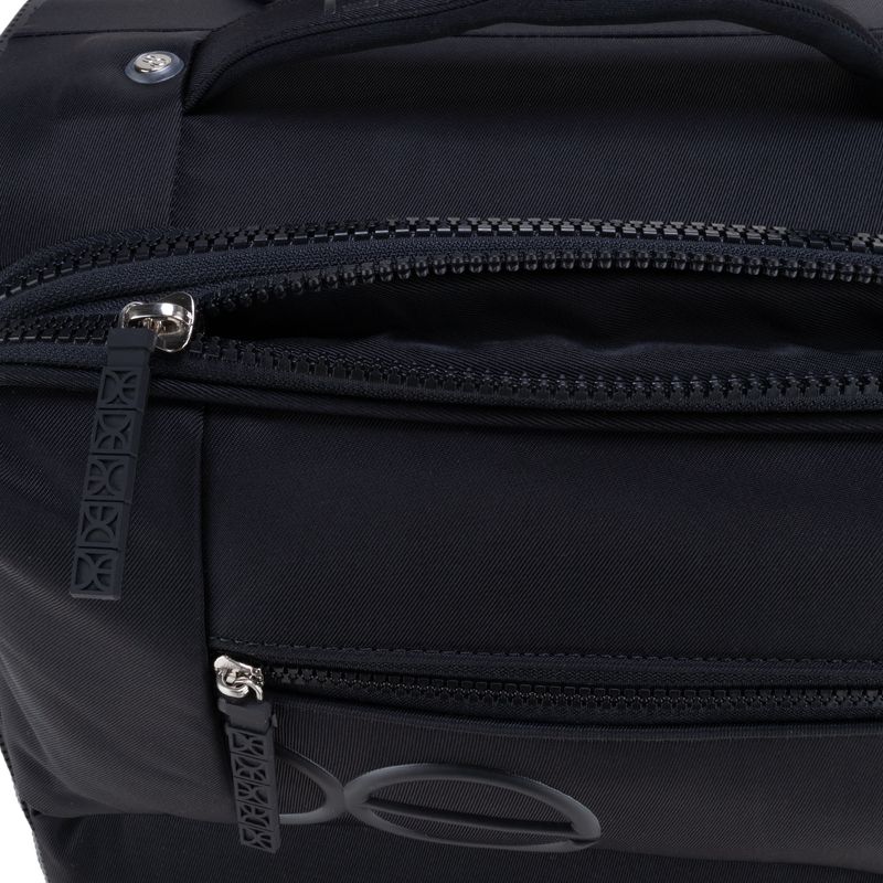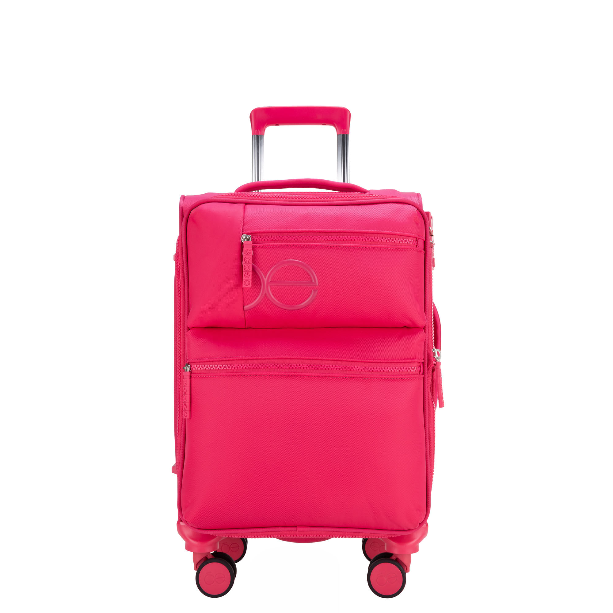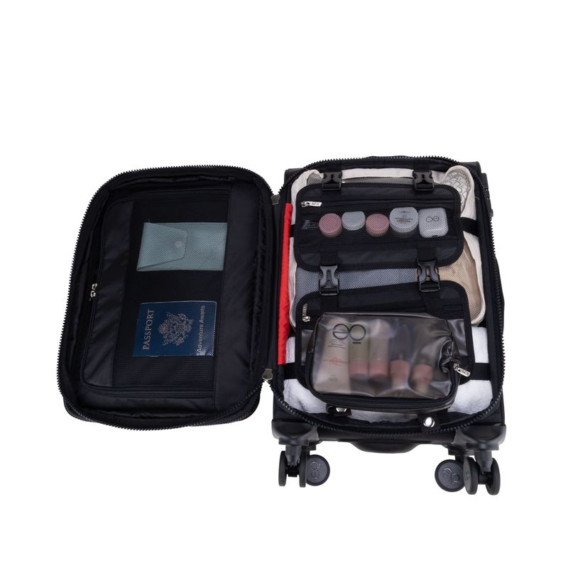Equipaje hecho con material textil resistente. Cuenta con múltiples compartimentos frontales con cierre. Organizador desprendible. Cosmetiquera impermeable removible. Bastón de tres alturas. Cuatro ruedas dobles y silenciosas, con movimiento 360º. Expandible. Cerradura por combinación TSA.