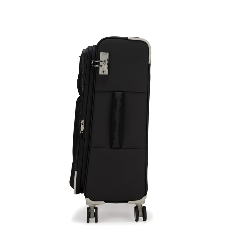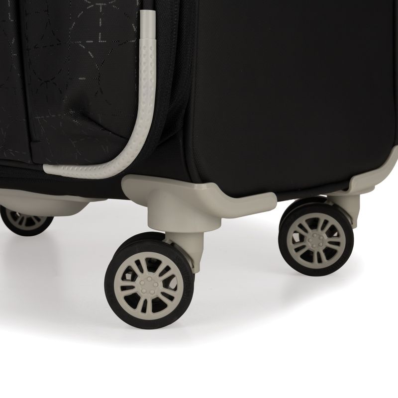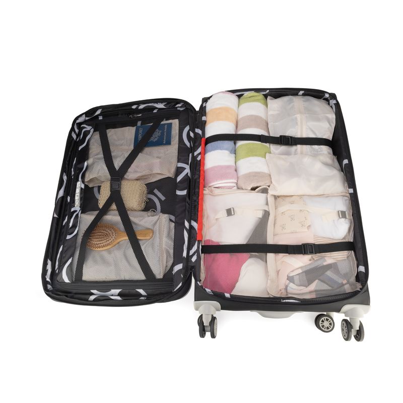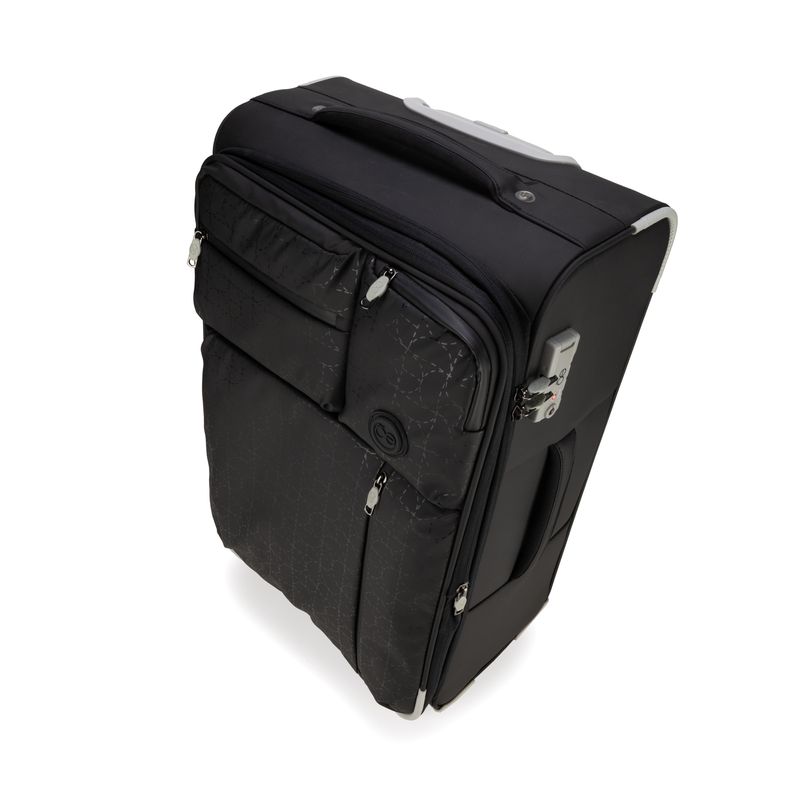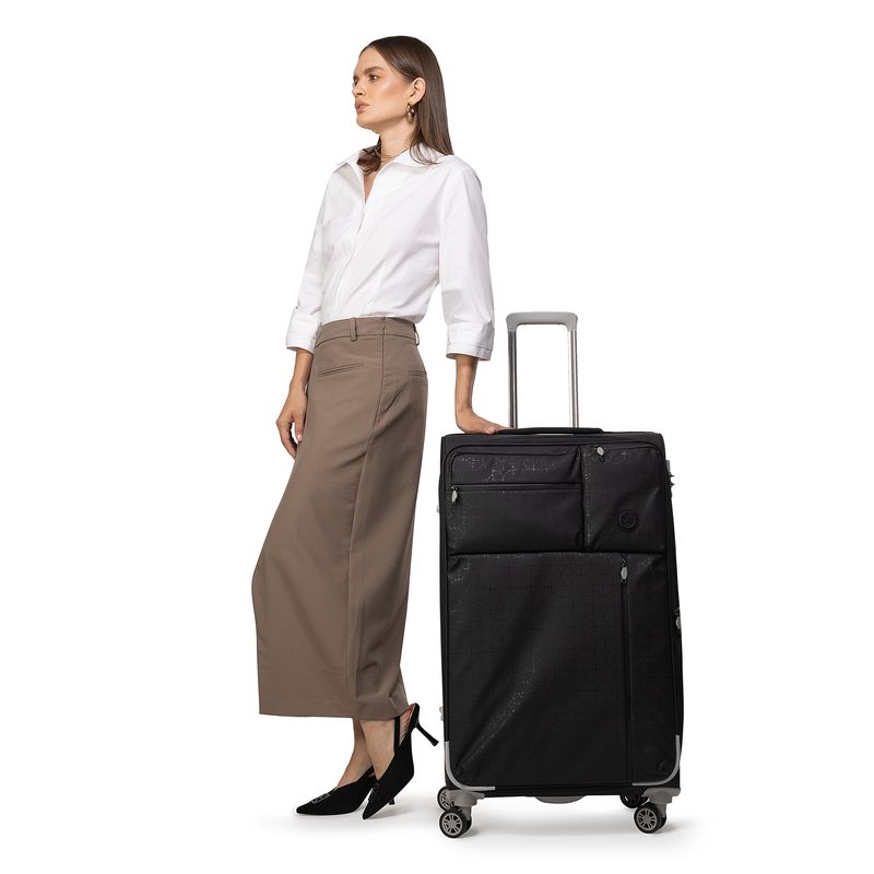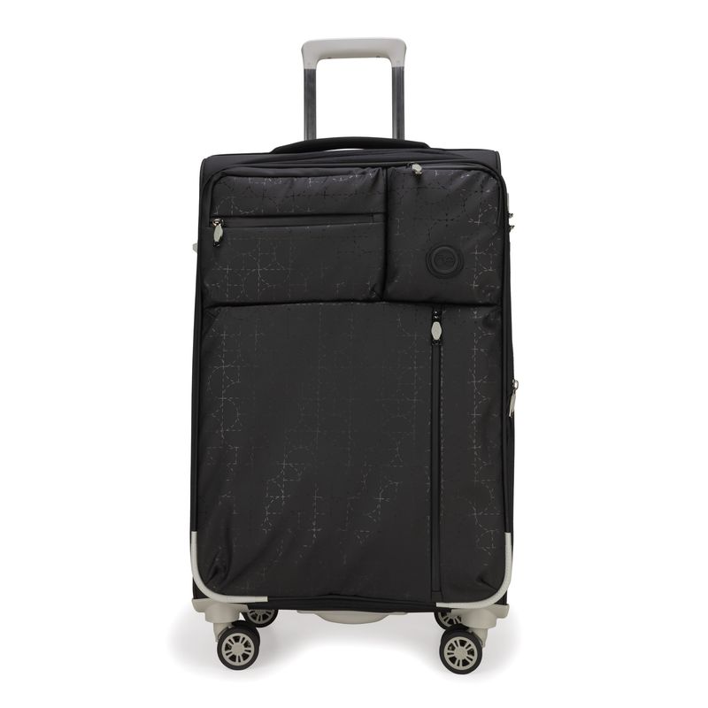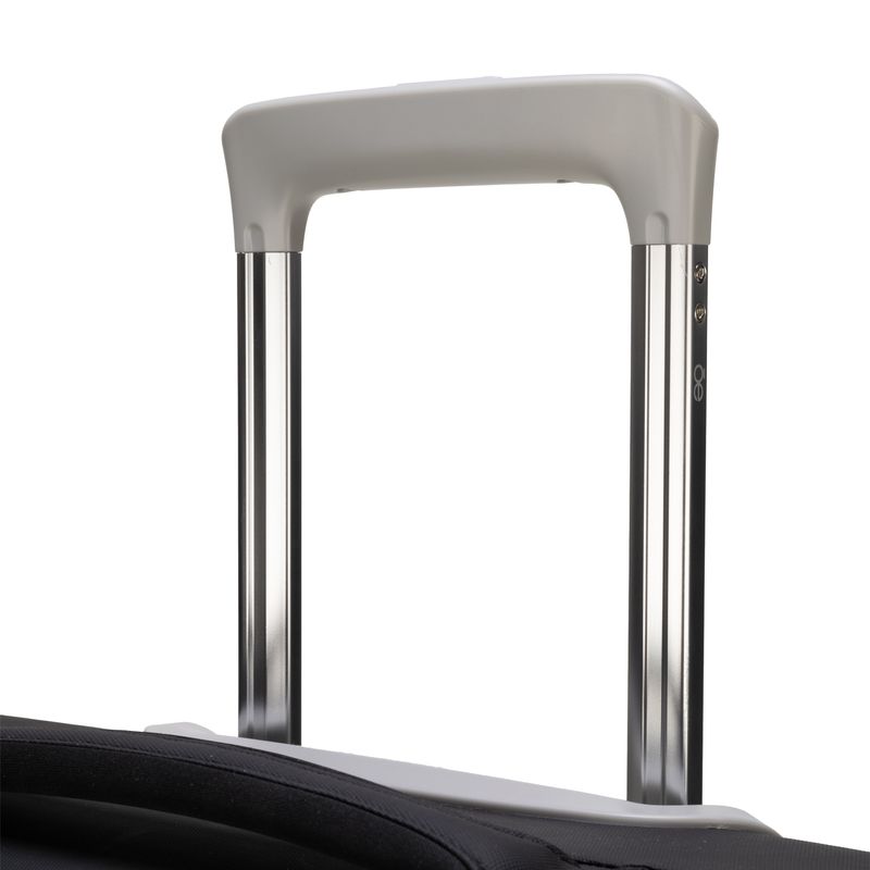 Equipaje Grande 28 plg para documentar hecha de material textil. Cuatro ruedas dobles y silenciosas, con movimiento 360º. Cerradura de combinación compatible con TSA. Bastón de dos alturas. Cosmetiquera removible.
