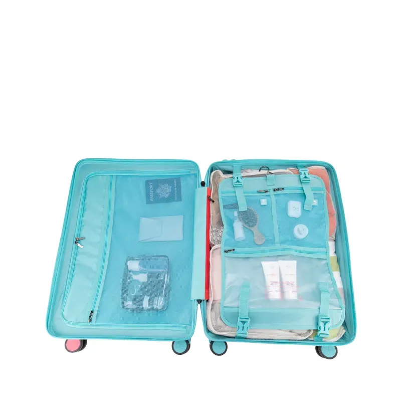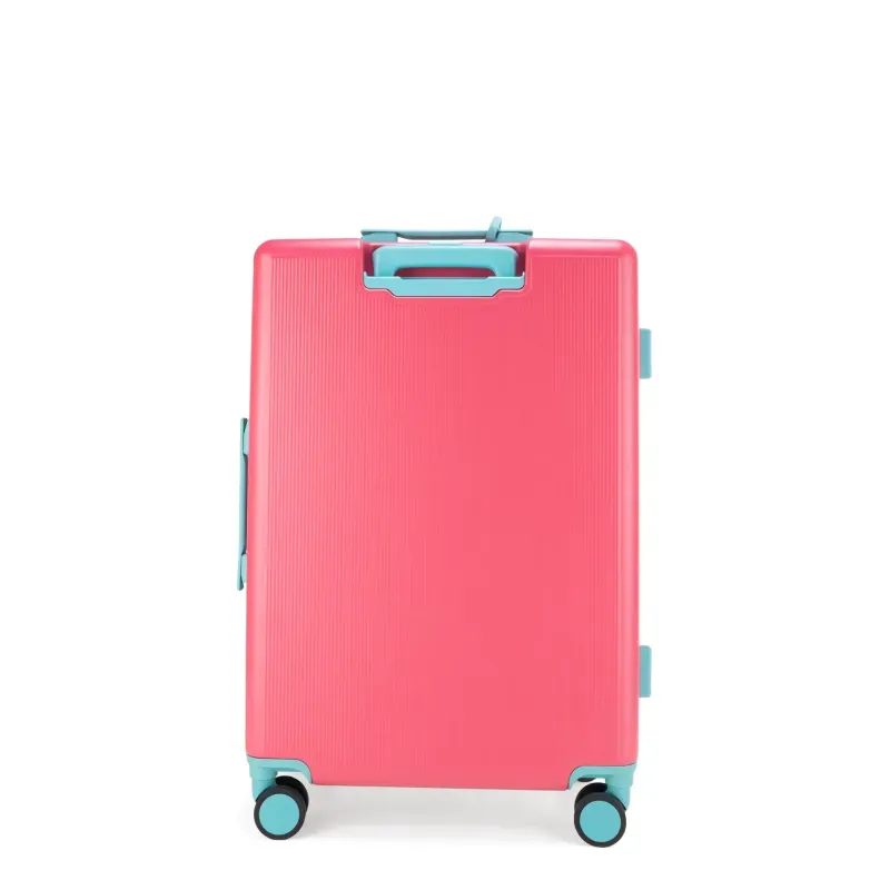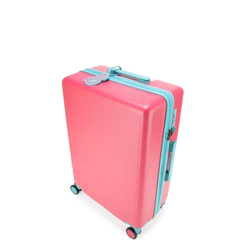 Equipaje vertical hecho con material policarbonato rígido. Cuenta con candado por combinación de seguridad TSA. Tiene ligero bastón de dos alturas. Cuatro ruedas dobles giratorias con movimiento 360°. Identificador desprendible. Incluye funda textil protectora.