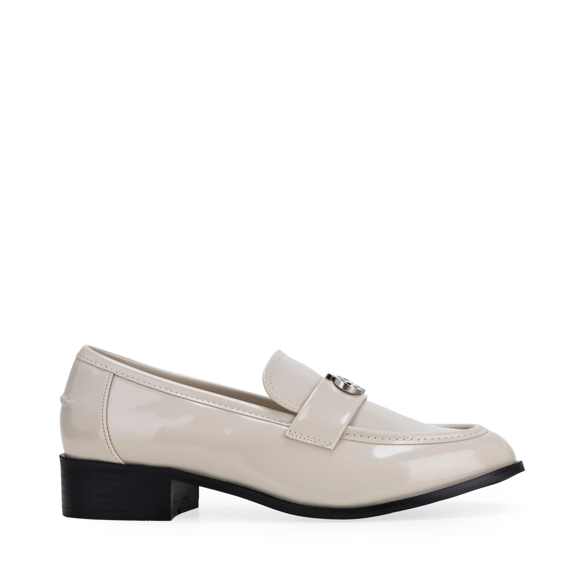 Mocasín hecho con material vegano acabado glossy. Tiene diseño de punta redonda de alta tendencia. Cuenta con herraje metálico de monograma al frente.