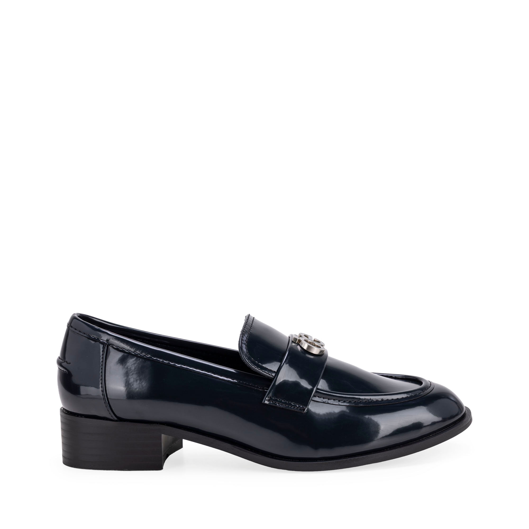 Mocasín hecho con material vegano acabado glossy. Tiene diseño de punta redonda de alta tendencia. Cuenta con herraje metálico de monograma al frente.