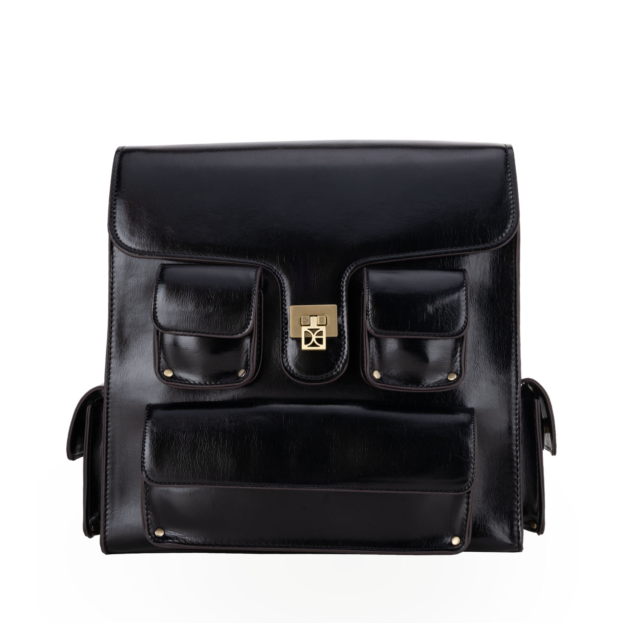 Backpack hecha con material vegano apariencia piel. Cuenta con compartimentos externos de fácil acceso. Broche metálico de monograma. Asas traseras ajustables.