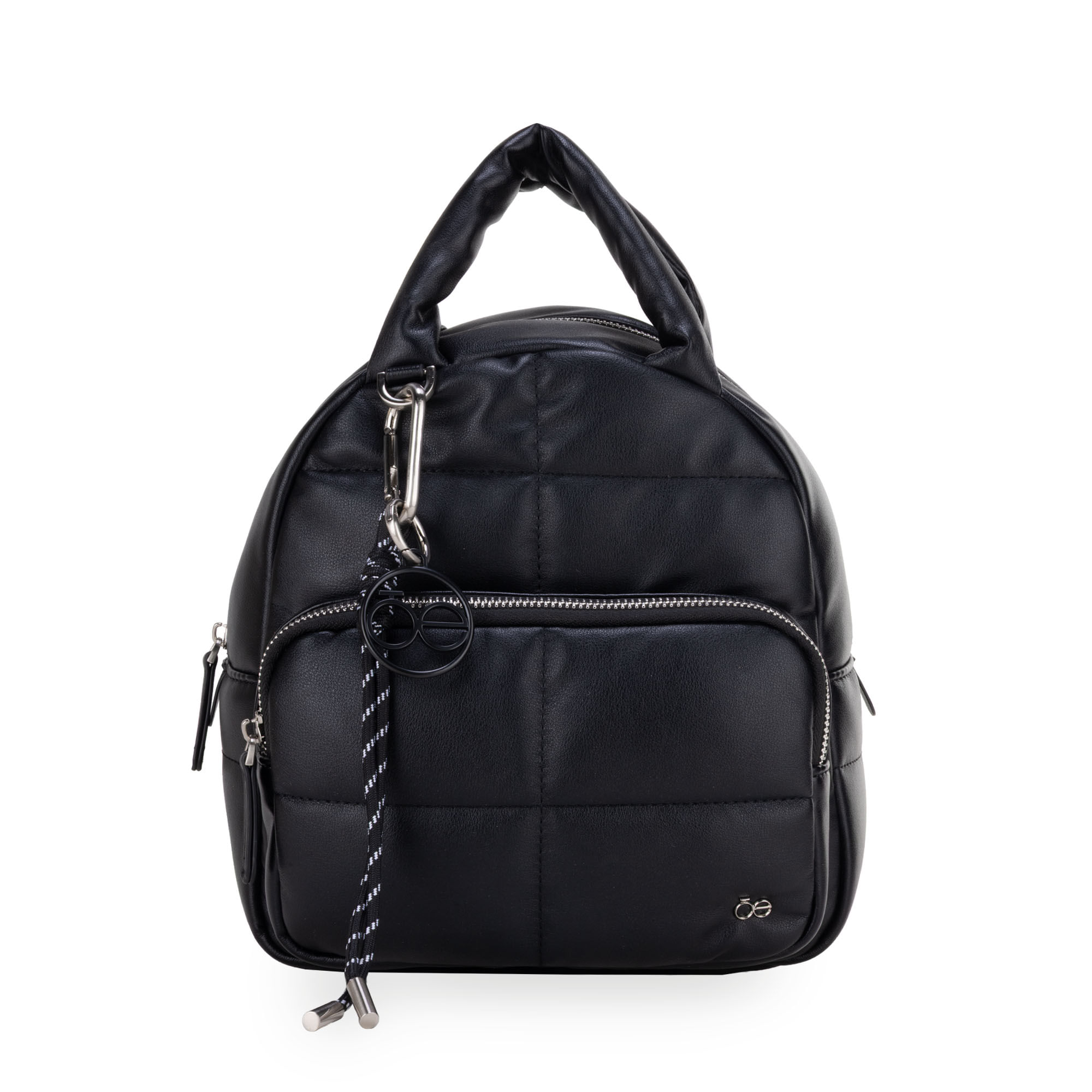 Backpack hecha con material vegano apariencia piel diseño acolchado. Cuenta con cierre metálico de larga duración. Charm decorativo desprendible. Asas traseras ajustables