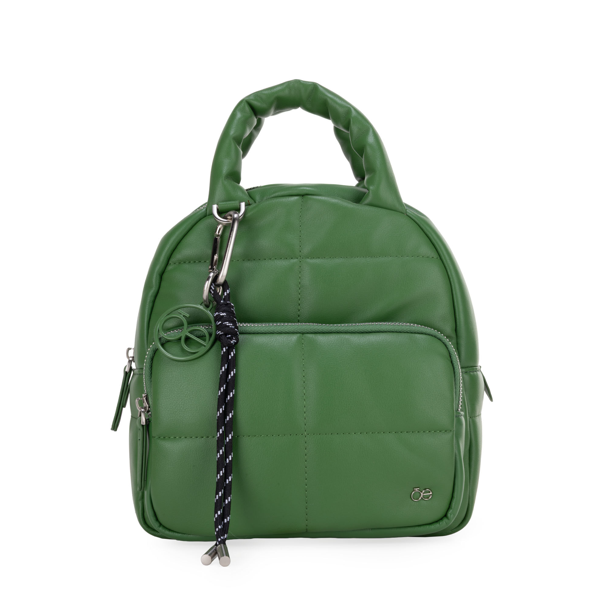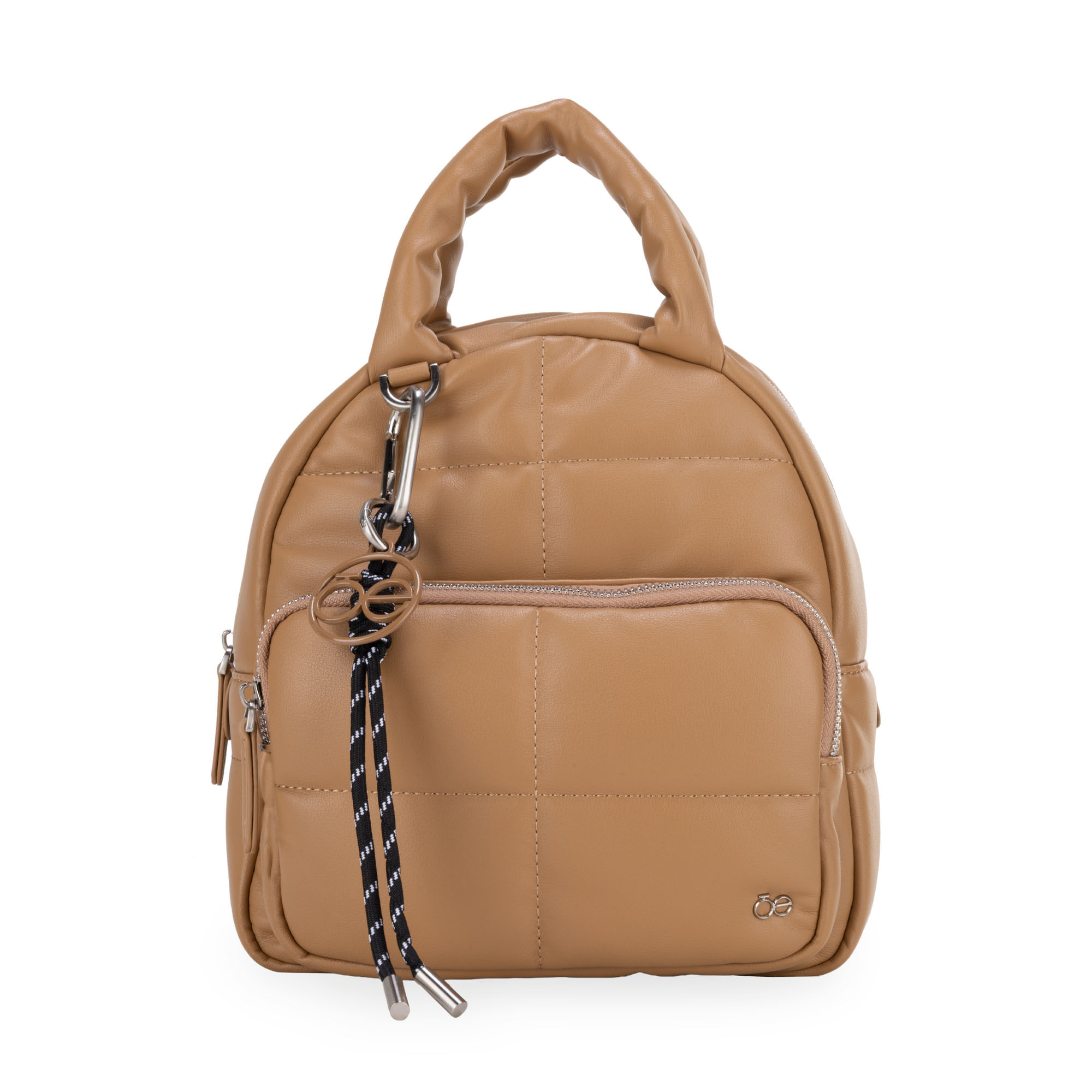 Backpack hecha con material vegano apariencia piel diseño acolchado. Cuenta con cierre metálico de larga duración. Charm decorativo desprendible. Asas traseras ajustables
