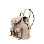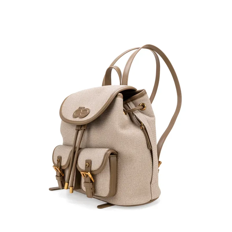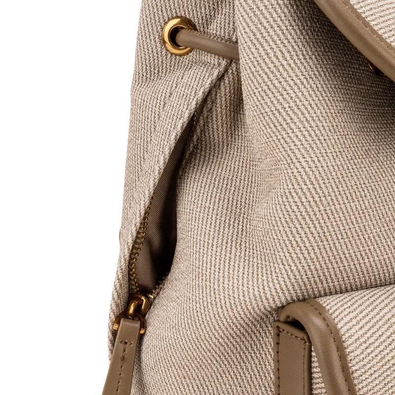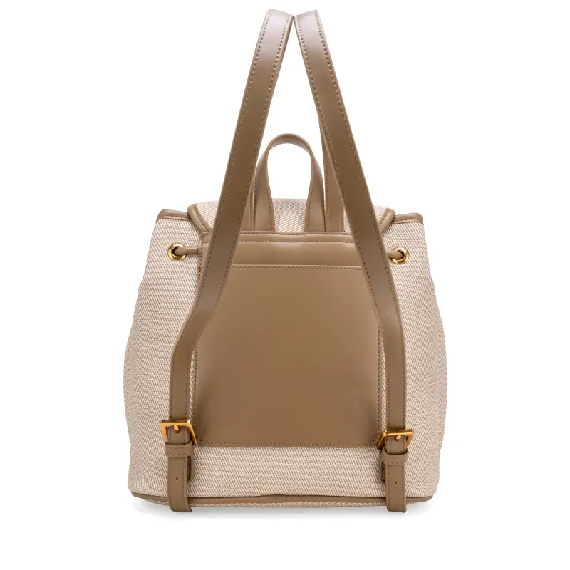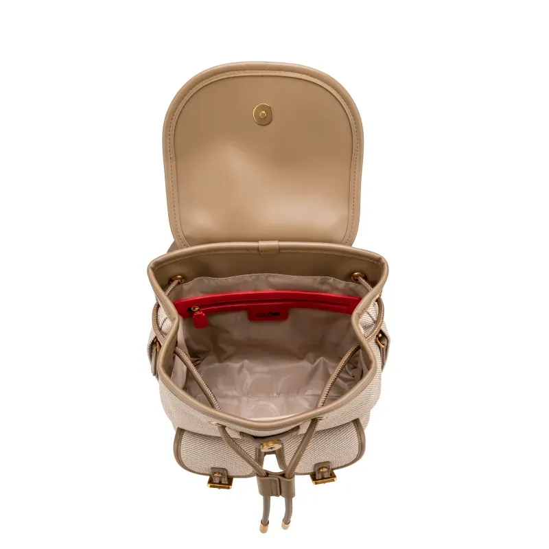 Backpack hecho con material vegano apariencia textil. Cuenta con tapeta con broche magnético. Jareta ajustable. Parche de monograma. Compartimentos forntales con tapeta. Maneral superior de fácil uso. Asas traseras ajustables para mayor comodidad.