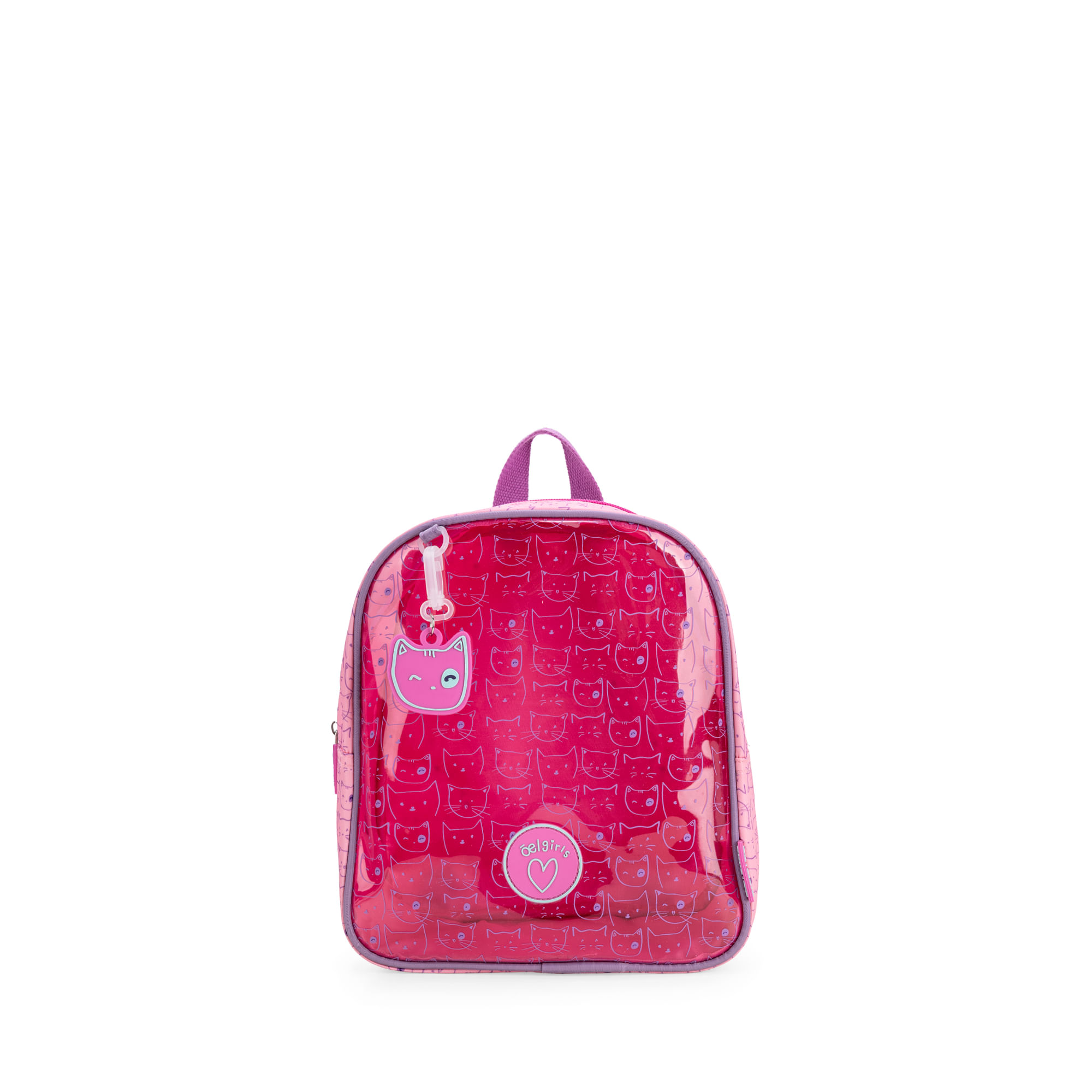 Mochila hecha con material mica transparente con estampado de gatos. Cuenta con charm decorativo desprendible. Tiene asas traseras ajustables.