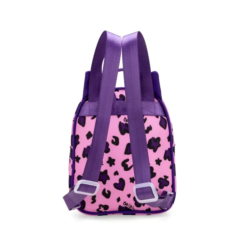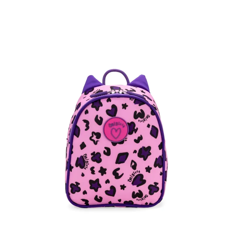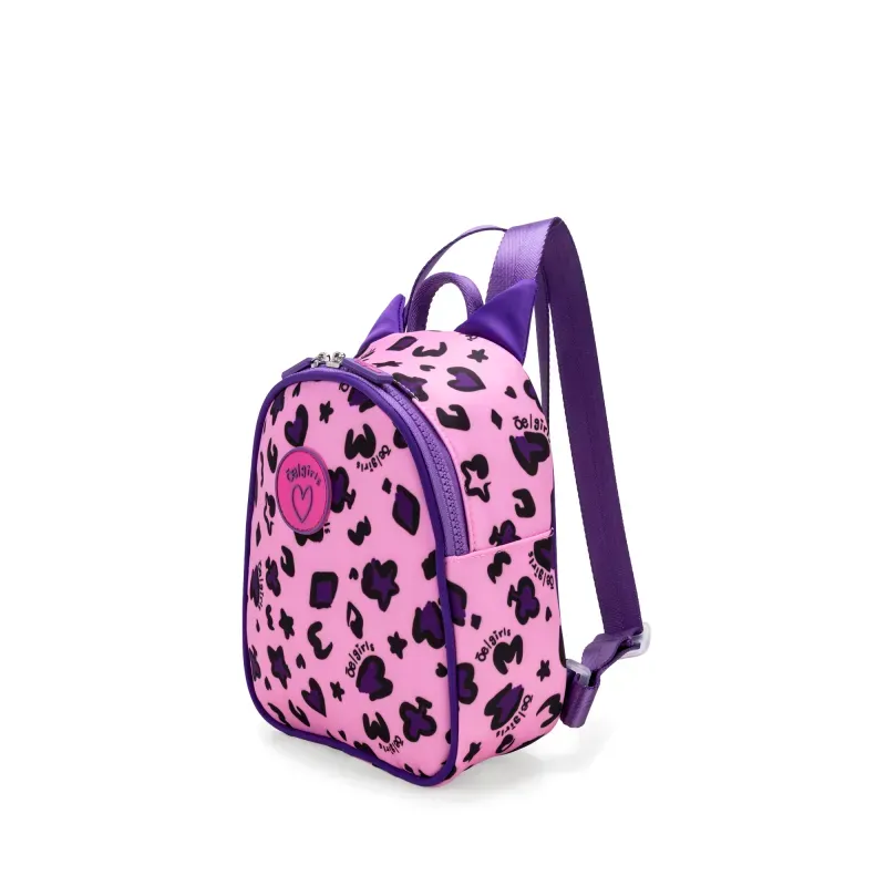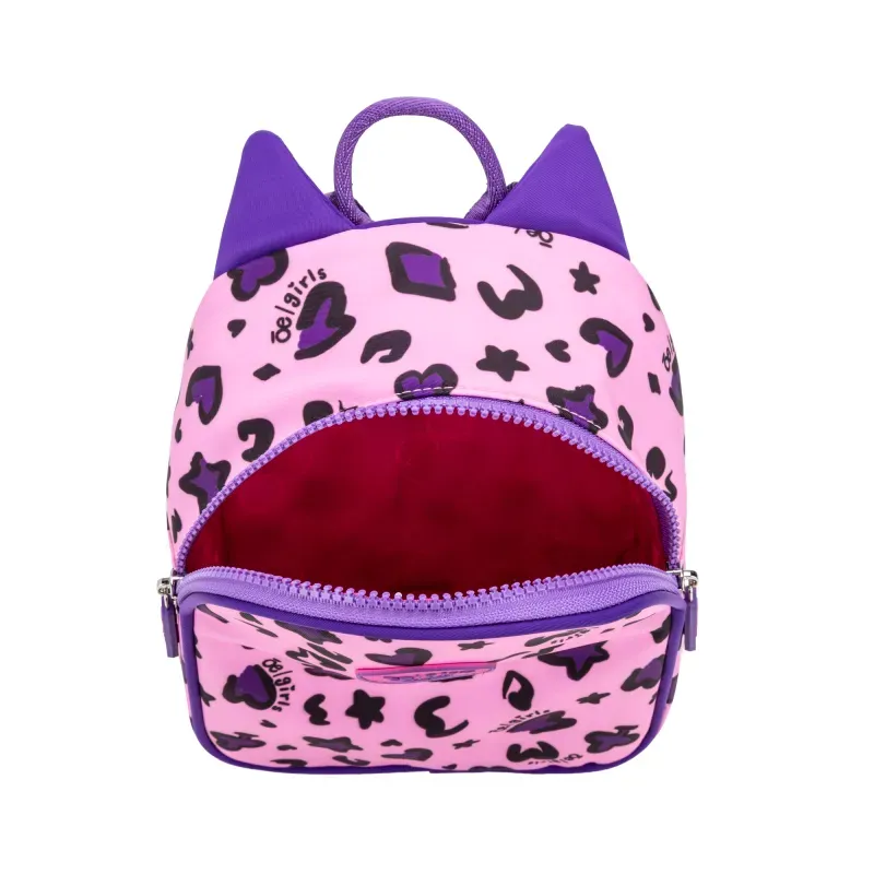 Backpack hecho con material textil. Cuenta con cierre de larga duración. Asas traseras ajustables. Estampado animal print. Tiene detalle de orejas decorativas.