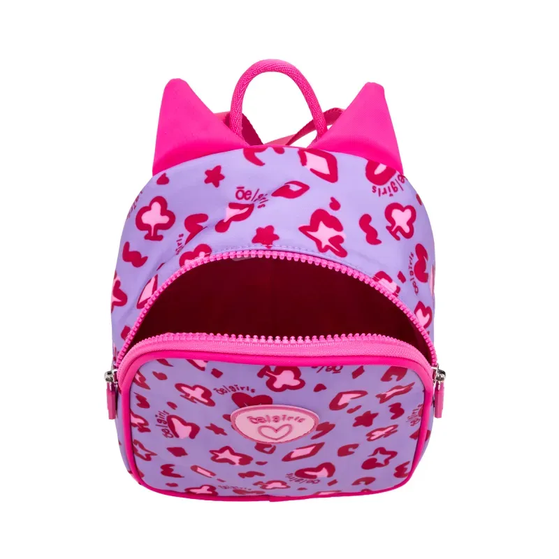 Backpack hecho con material textil. Cuenta con cierre de larga duración. Asas traseras ajustables. Estampado animal print. Tiene detalle de orejas decorativas.
