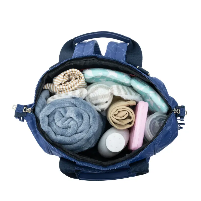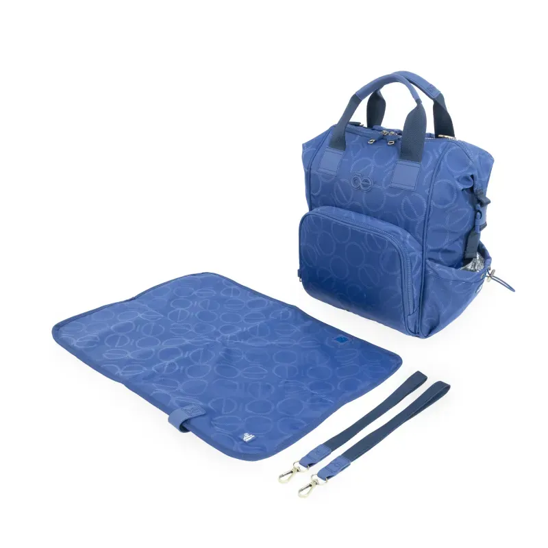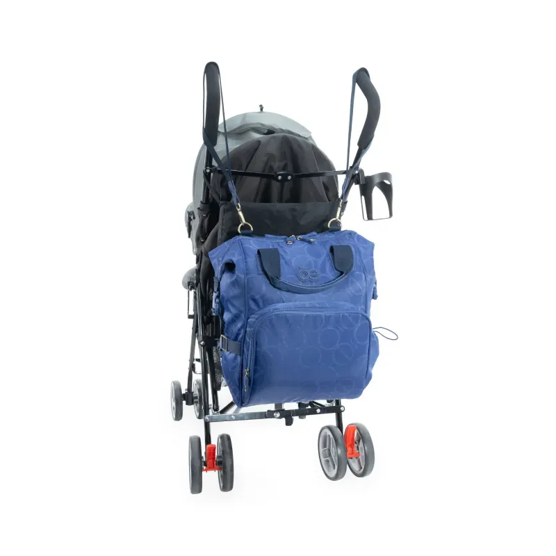 Pañalera Backpack hecha con material textil. Cuenta con asas traseras ajustables.Cambiador plegable. Múltiples compartimientos. Incluye ganchos para colgar en la carreola. Compartimientos frontales con cierre.