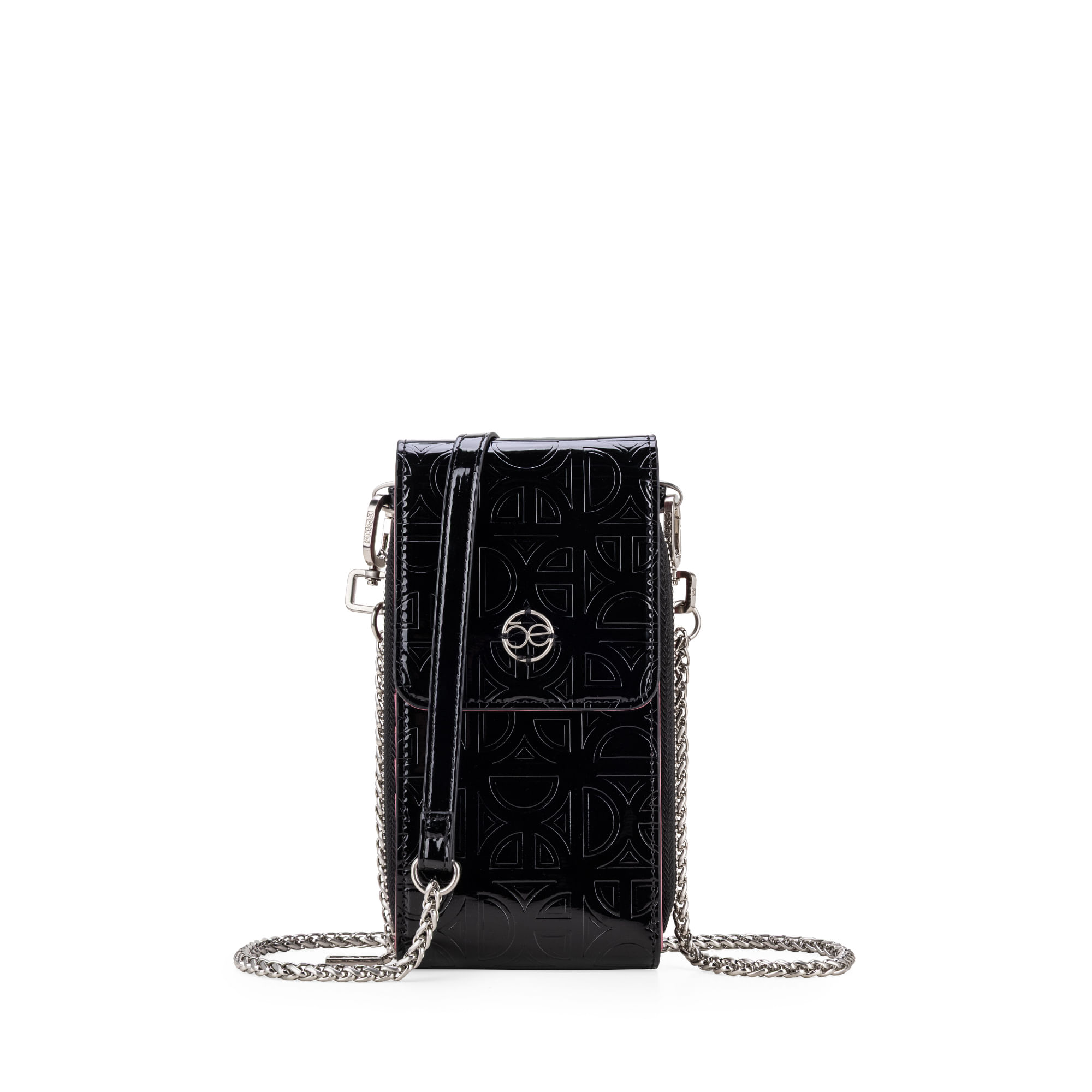 Porta celular hecho con material vegano apariencia piel. Cerradura por broche de presión. Look troquelado de monograma. Monedero interno. Compartimento interno para celular. Múltiples compartimentos internos para billetes y tarjetas. Asa larga con cadena removible.