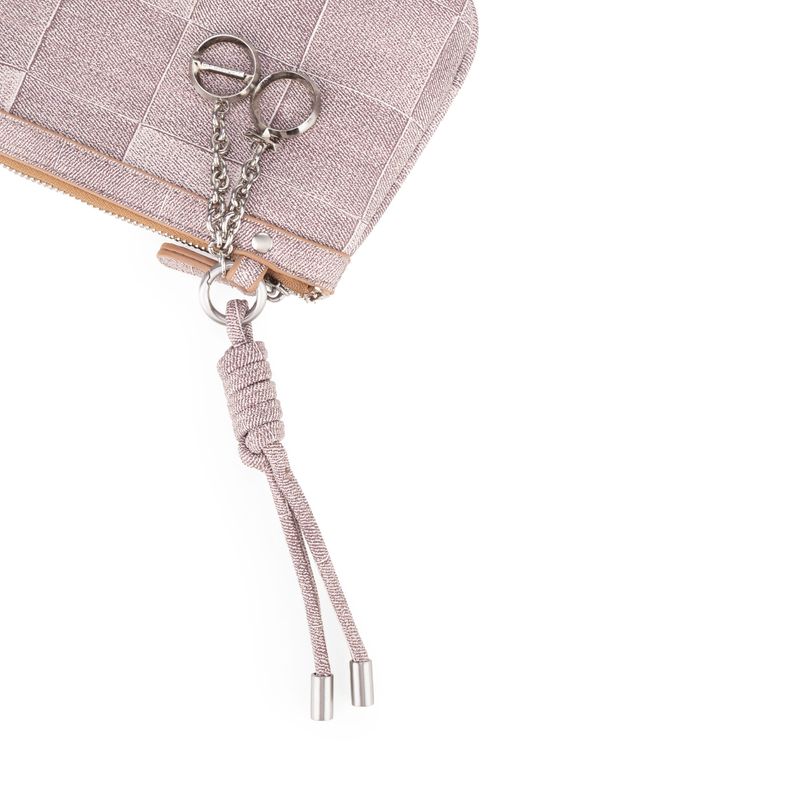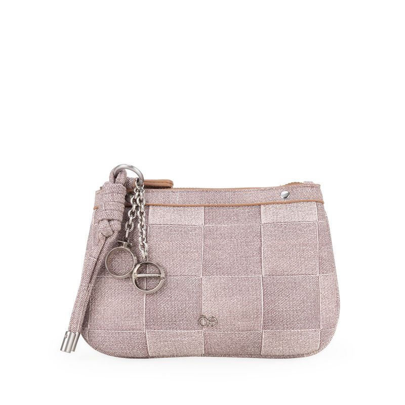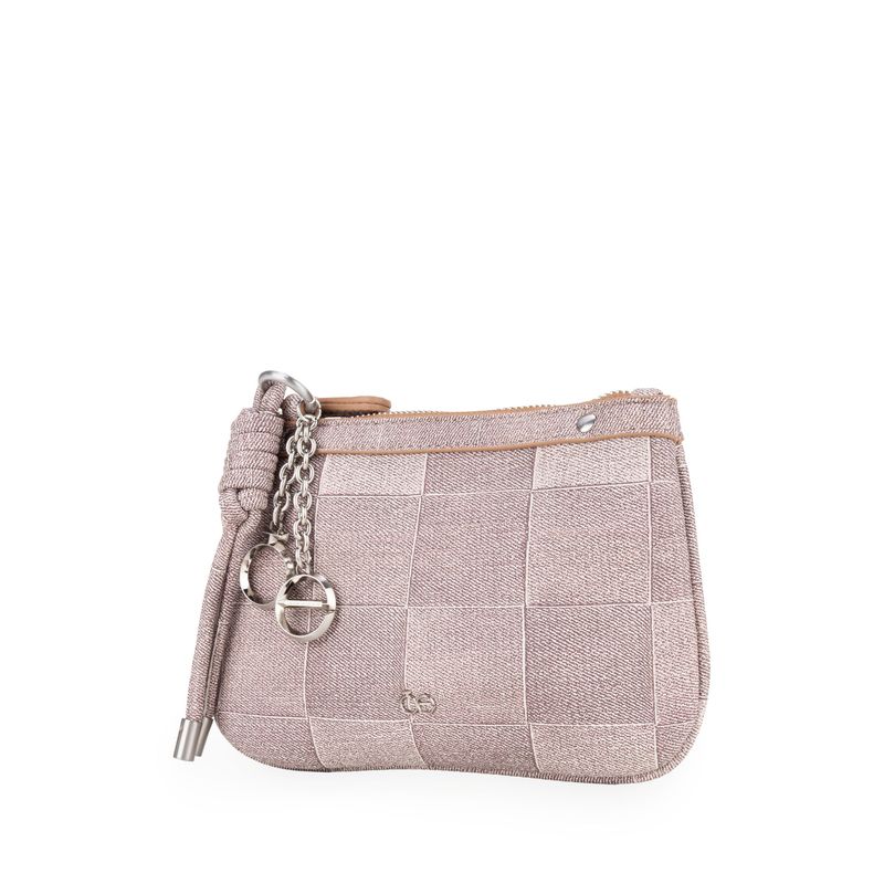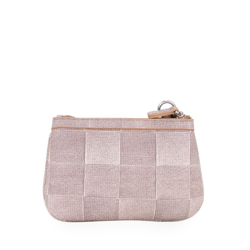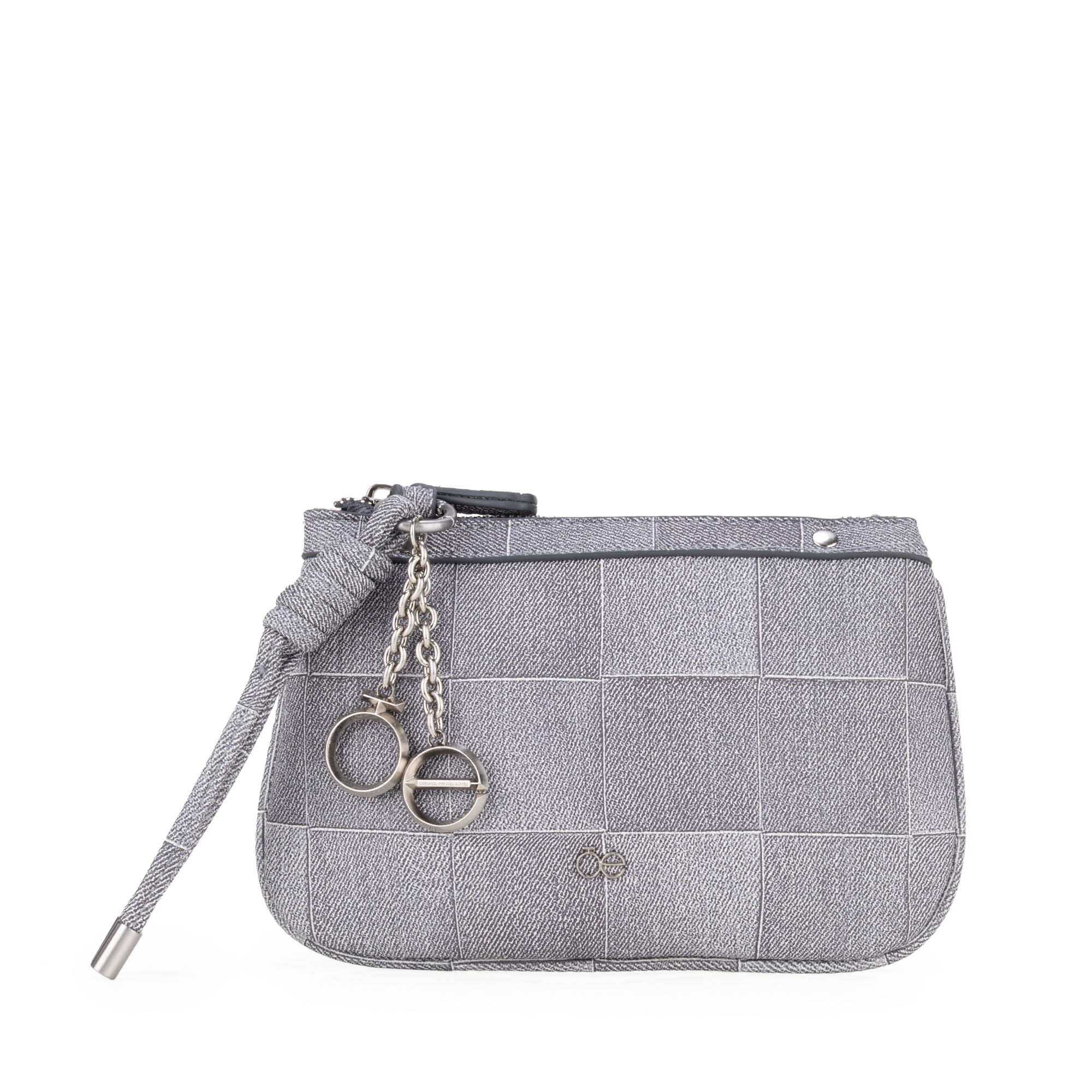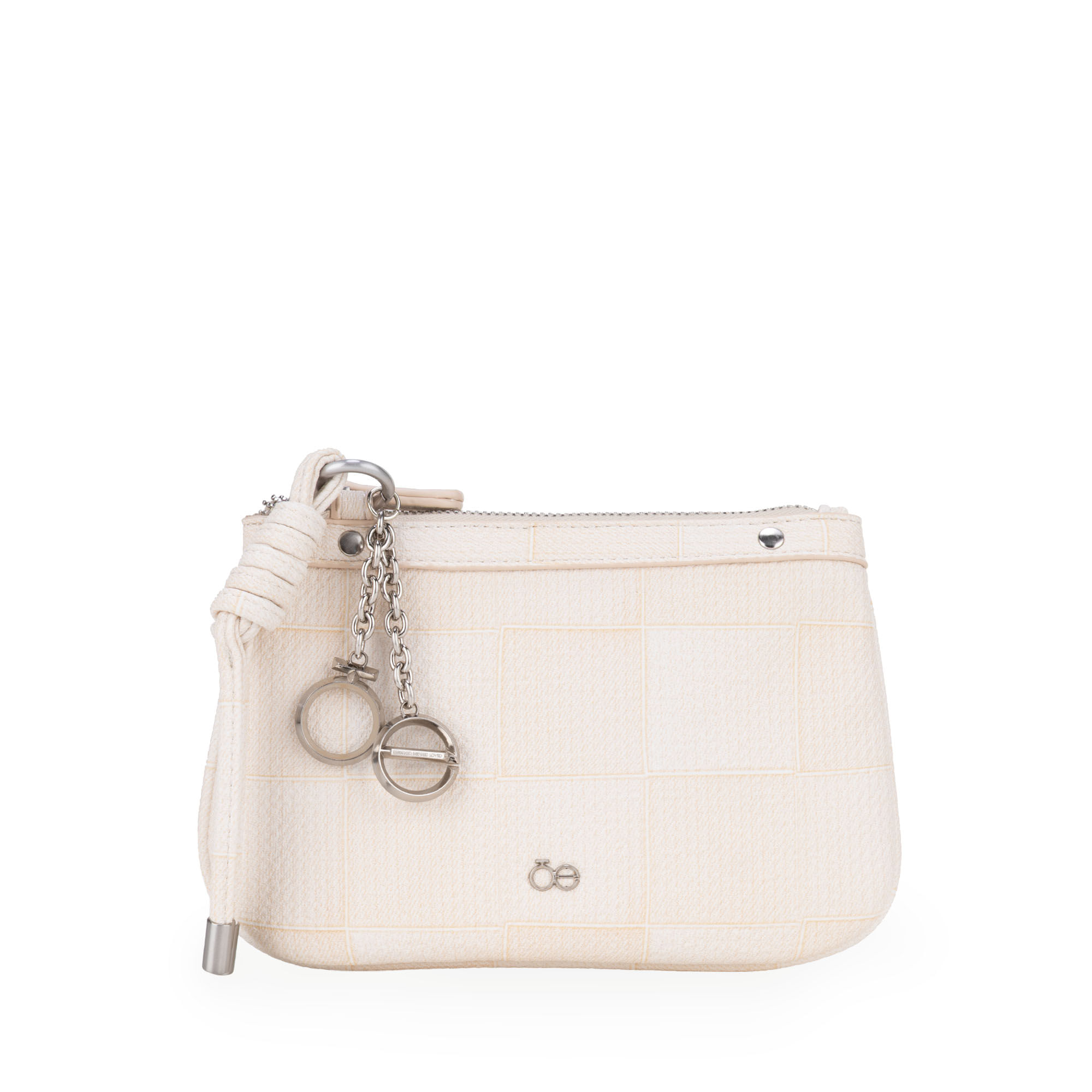 Pouch hecho con material vegano apariencia textil. Cuenta con cierre metálico de larga duración. Charm metálico de monograma. Herraje de monograma.