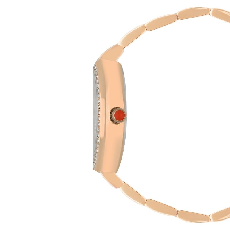 - Carátula con Acabado de Madre Perla - Corona Redpocket - 3ATM - Movimiento de cuarzo - Indicadores sin número - Correa de acero inoxidable - Tres Manecillas - Pedrería en Bisel -