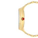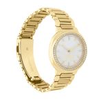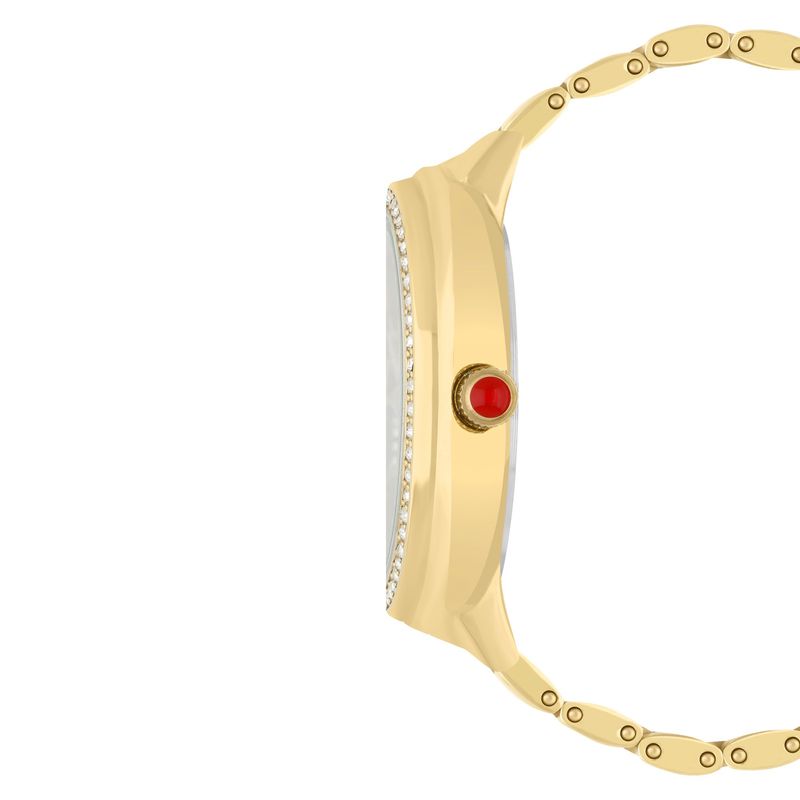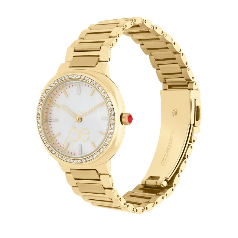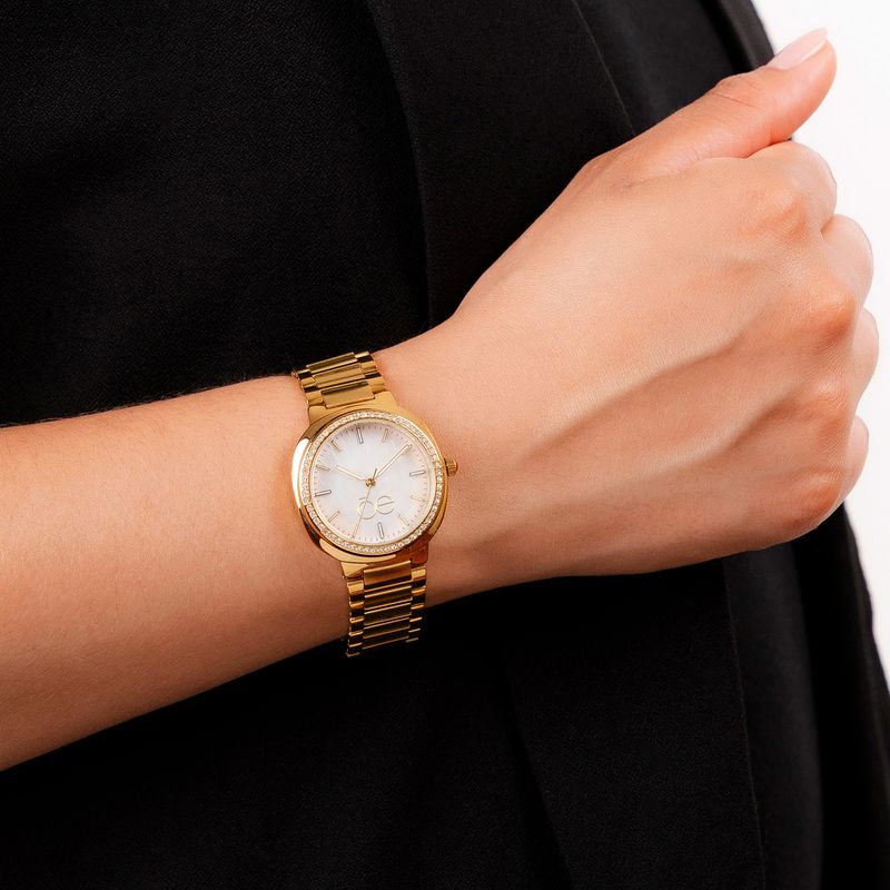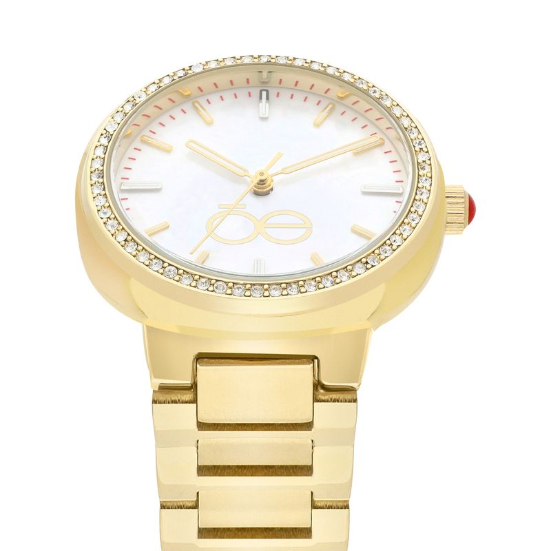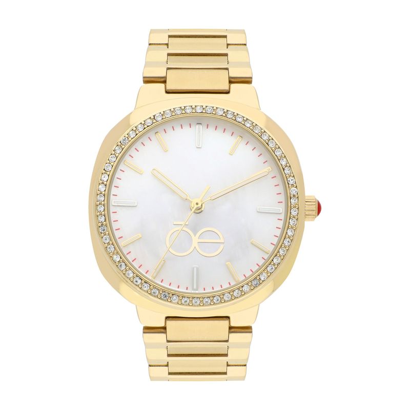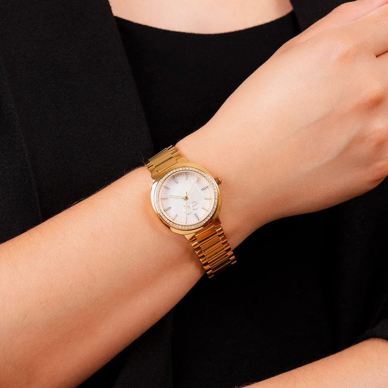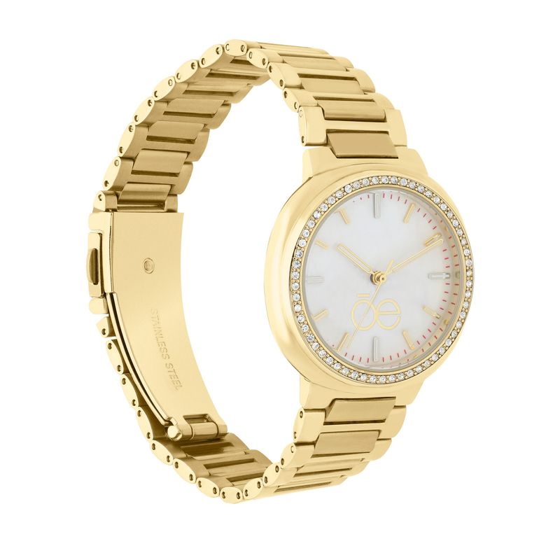 Un diseño elegante con toques brillantes. Este reloj Cloe destaca por su carátula con acabado de madre perla y bisel decorado con pedrería, que le aporta un brillo sutil. Ideal para ocasiones especiales.