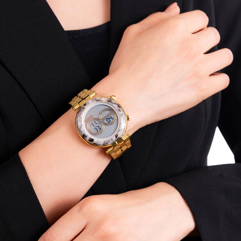 Este reloj digital Cloe combina un bisel tipo mármol con extensible metálico, creando una pieza única que mezcla estilo y funcionalidad. Su carátula le da un toque fresco y diferente para todos los días.
