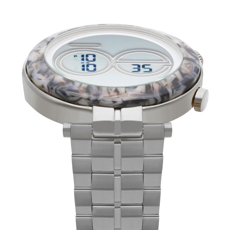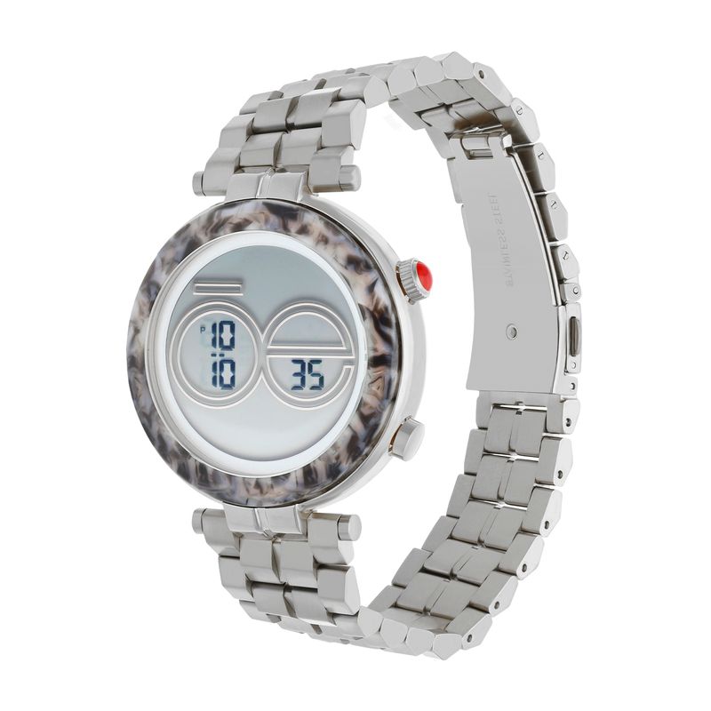 Este reloj digital Cloe combina un bisel tipo mármol con extensible metálico, creando una pieza única que mezcla estilo y funcionalidad. Su carátula le da un toque fresco y diferente para todos los días.