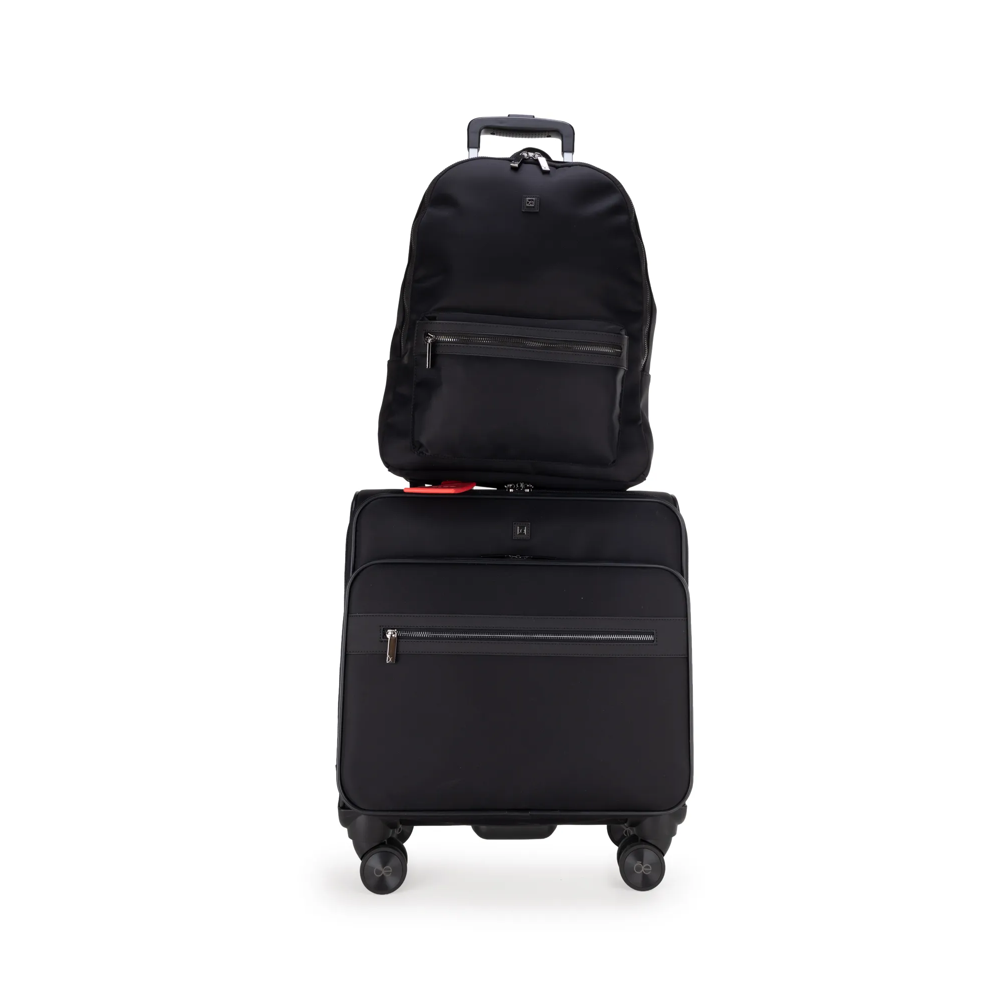 Set de Viaje Equipaje de Cabina. Cuenta con organizador interno de maleta. Compartimientos en exterior. Cuenta con cuatro ruedas dobles y silenciosas con movimeinto 360°. Incluye mochila con compartimento para Laptopn 15 plg. Apilable en equipaje de bastón. Asas traseras ajustables. Tiene bastón de tres alturas